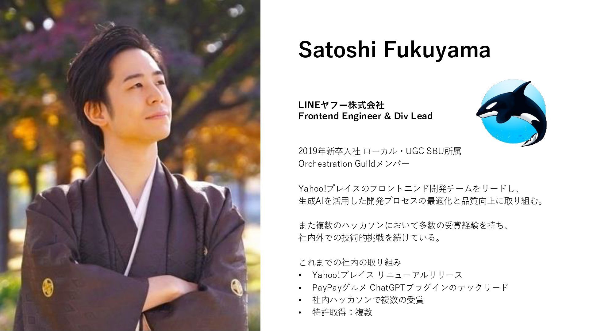 1. © LY Corporation 2 Satoshi Fukuyama 2019年新卒入社 ローカル・UGC SBU所属 Orchestration