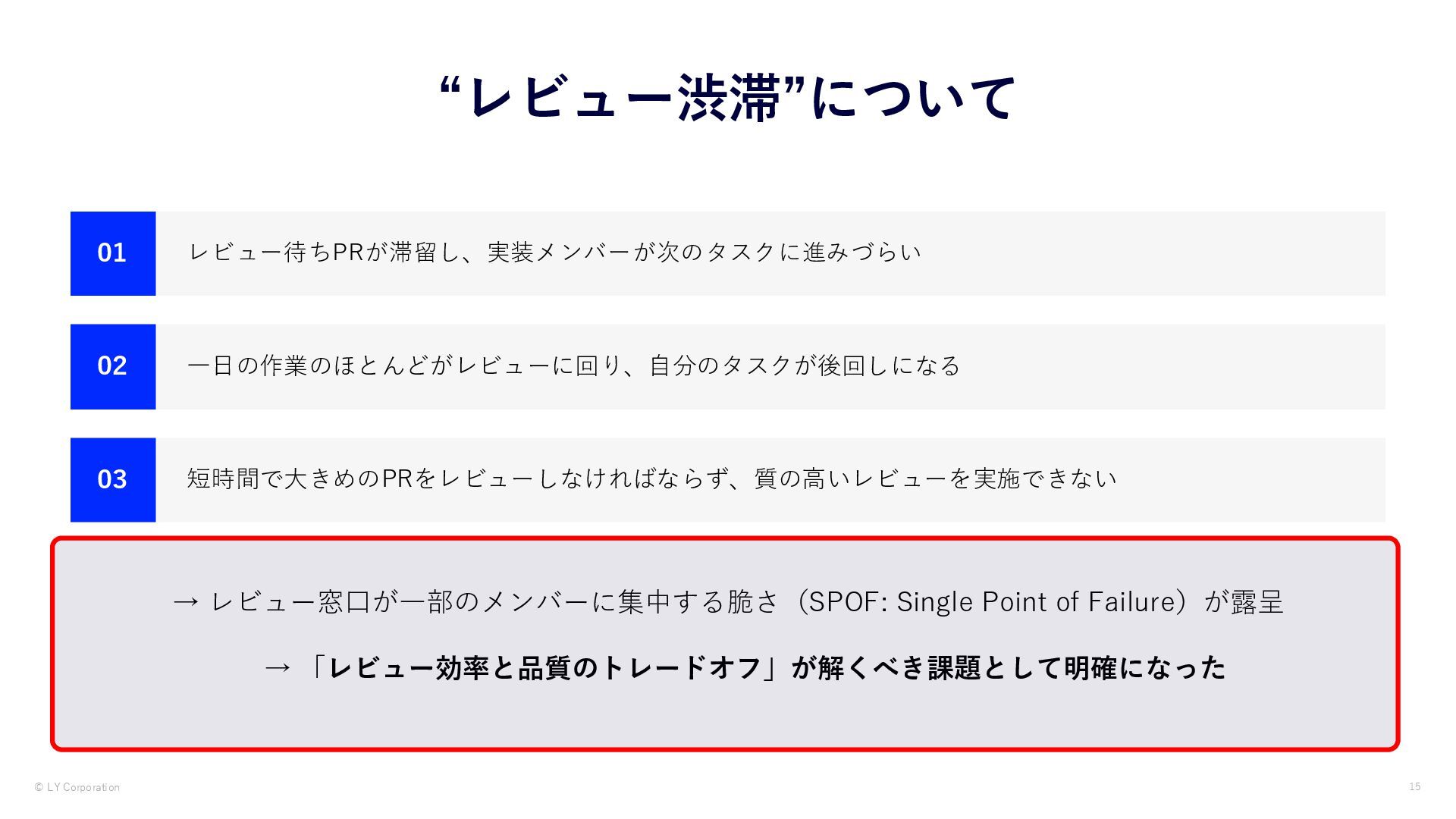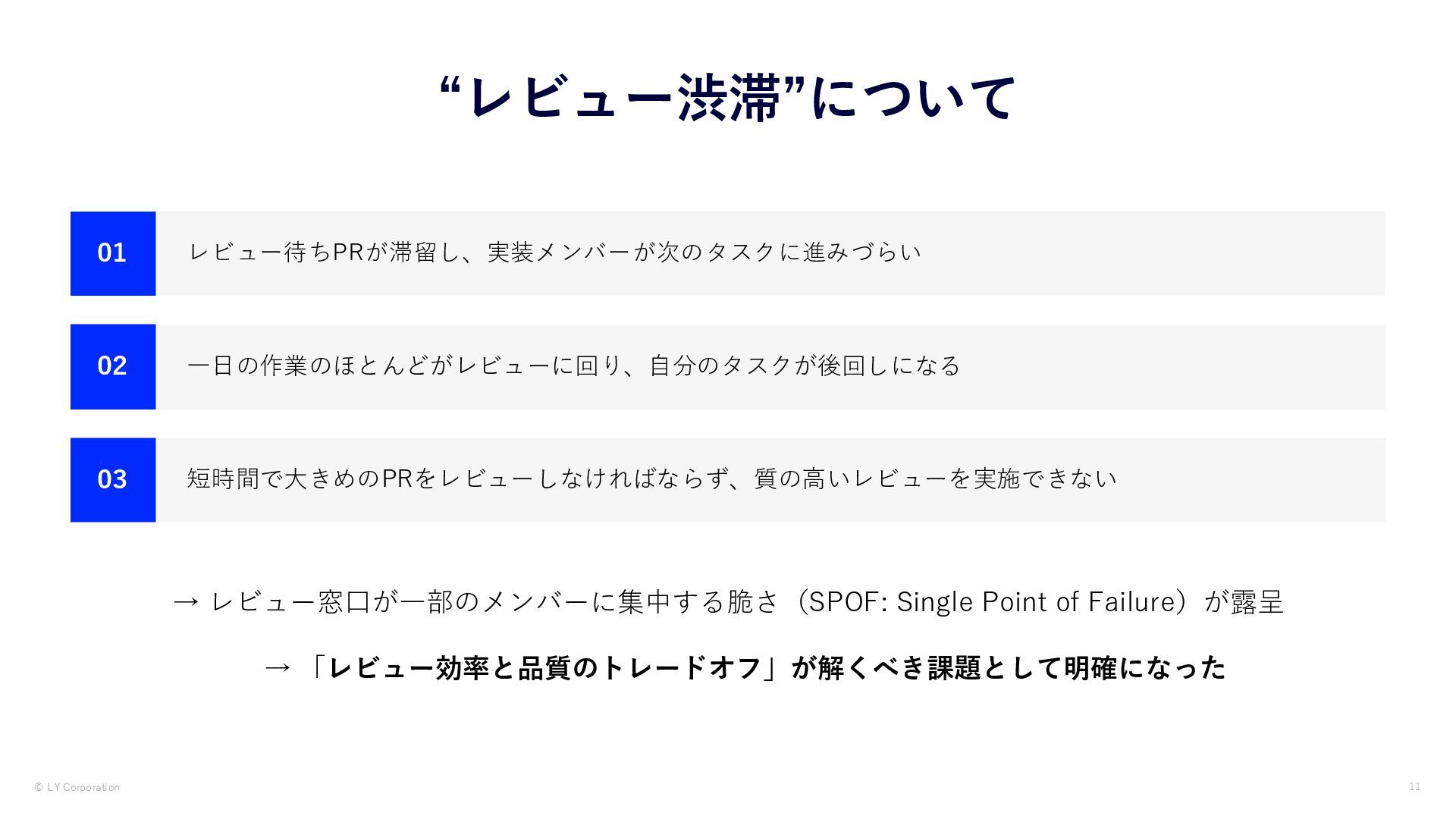 10. © LY Corporation レビュー待ちPRが滞留し、実装メンバーが次のタスクに進みづらい 一日の作業のほとんどがレビューに回り、自分のタスクが後回しになる 短時間で大きめのPRをレビューしなければならず、質の高いレビューを実施できない 01 03 02 15