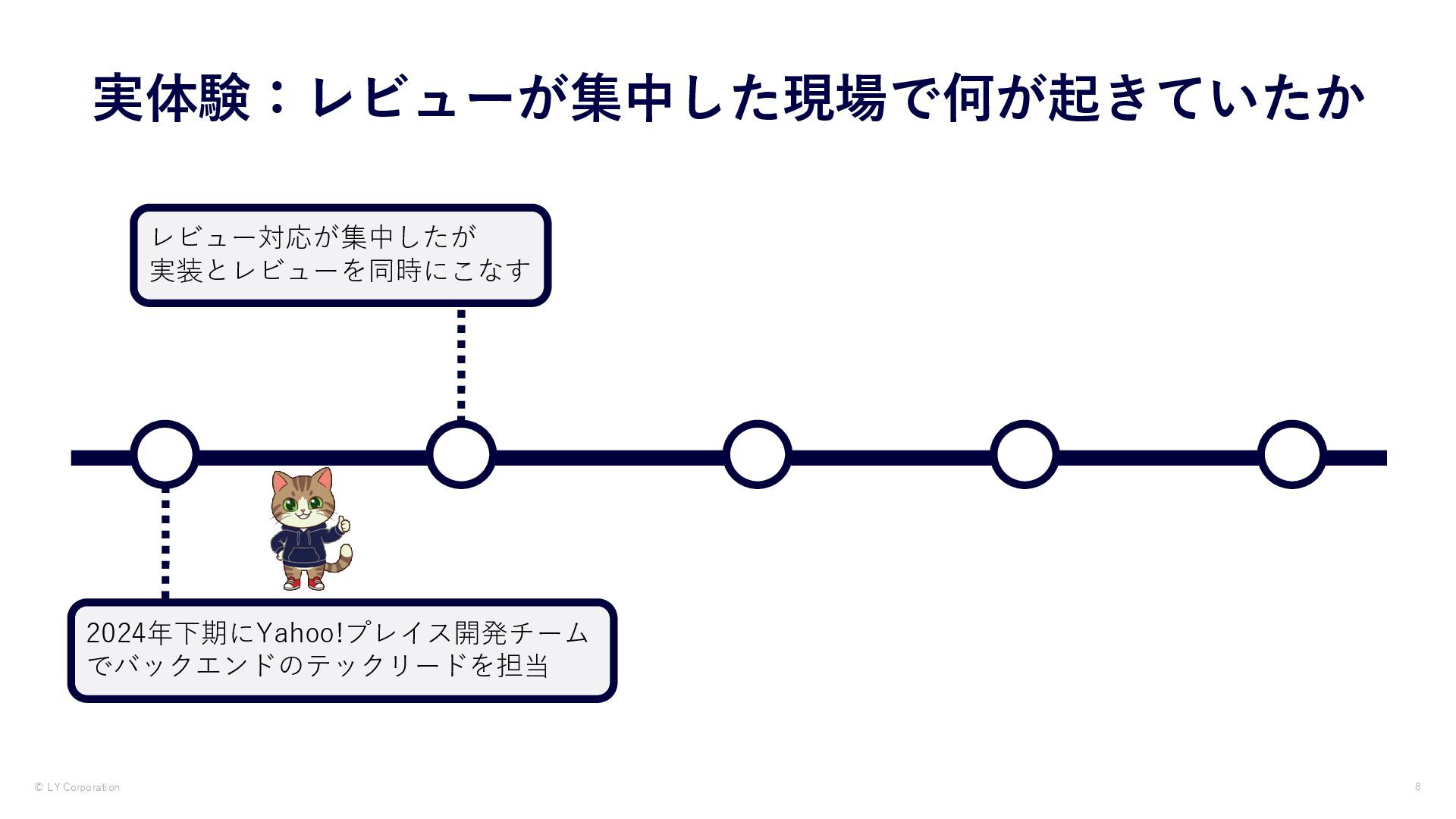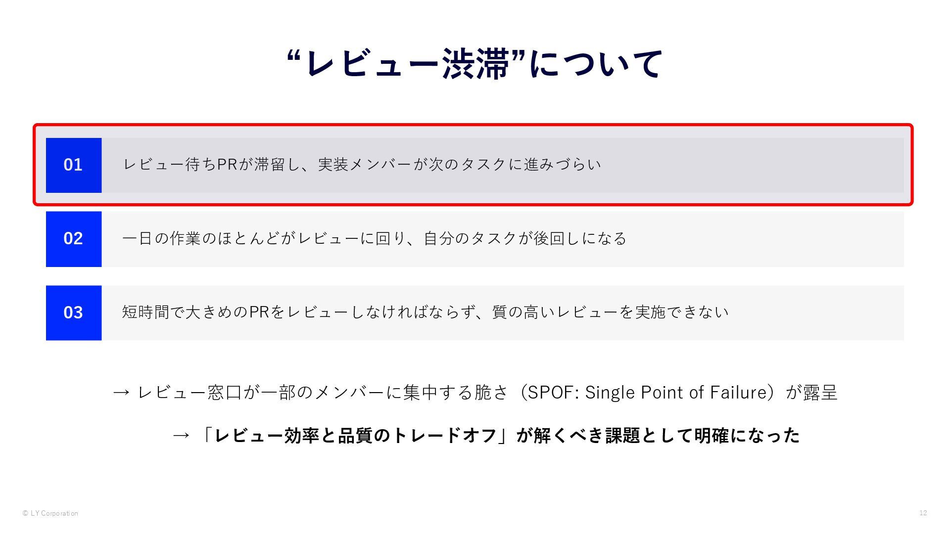 7. © LY Corporation レビュー待ちPRが滞留し、実装メンバーが次のタスクに進みづらい 一日の作業のほとんどがレビューに回り、自分のタスクが後回しになる 短時間で大きめのPRをレビューしなければならず、質の高いレビューを実施できない 01 03 02 12