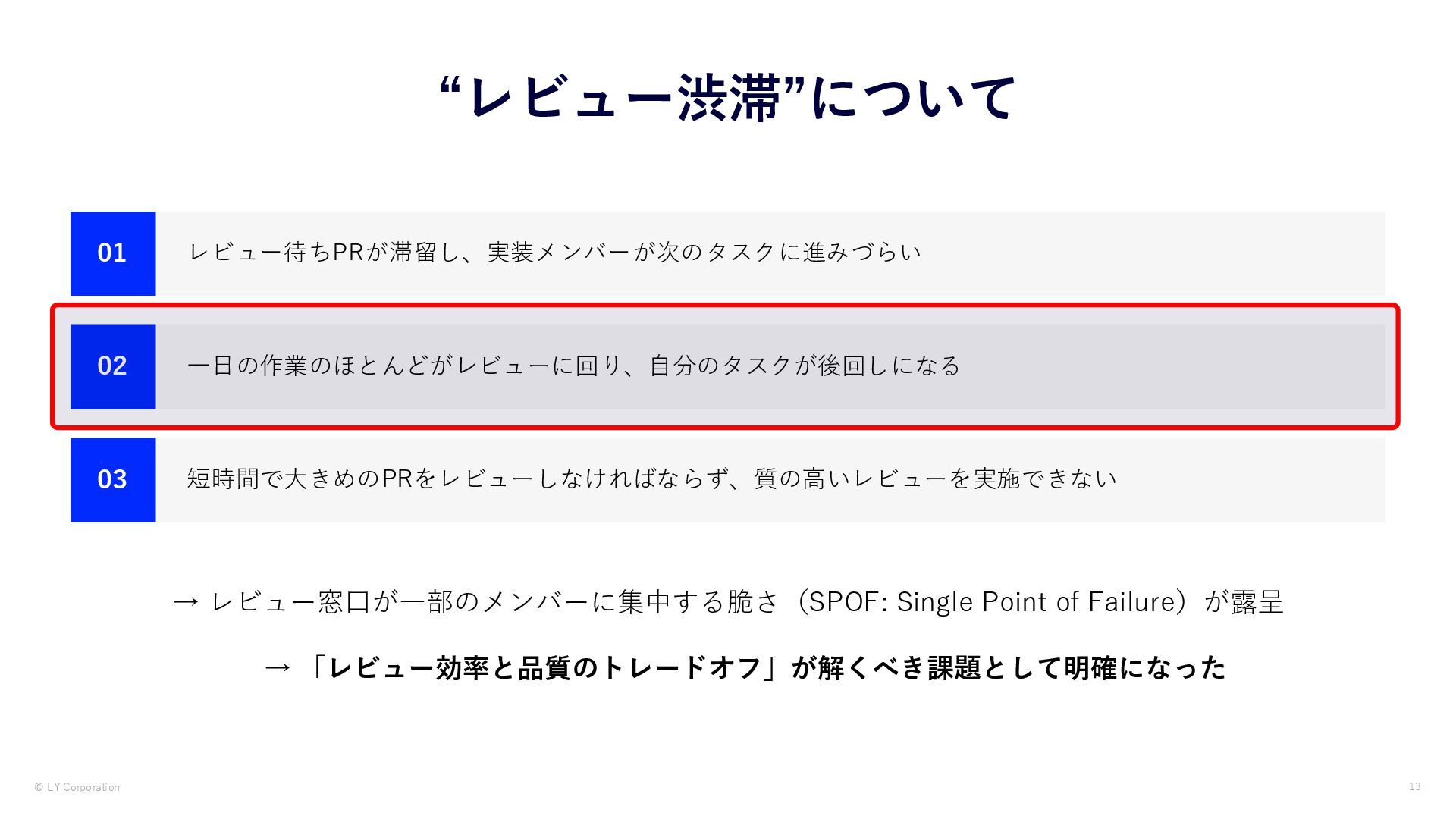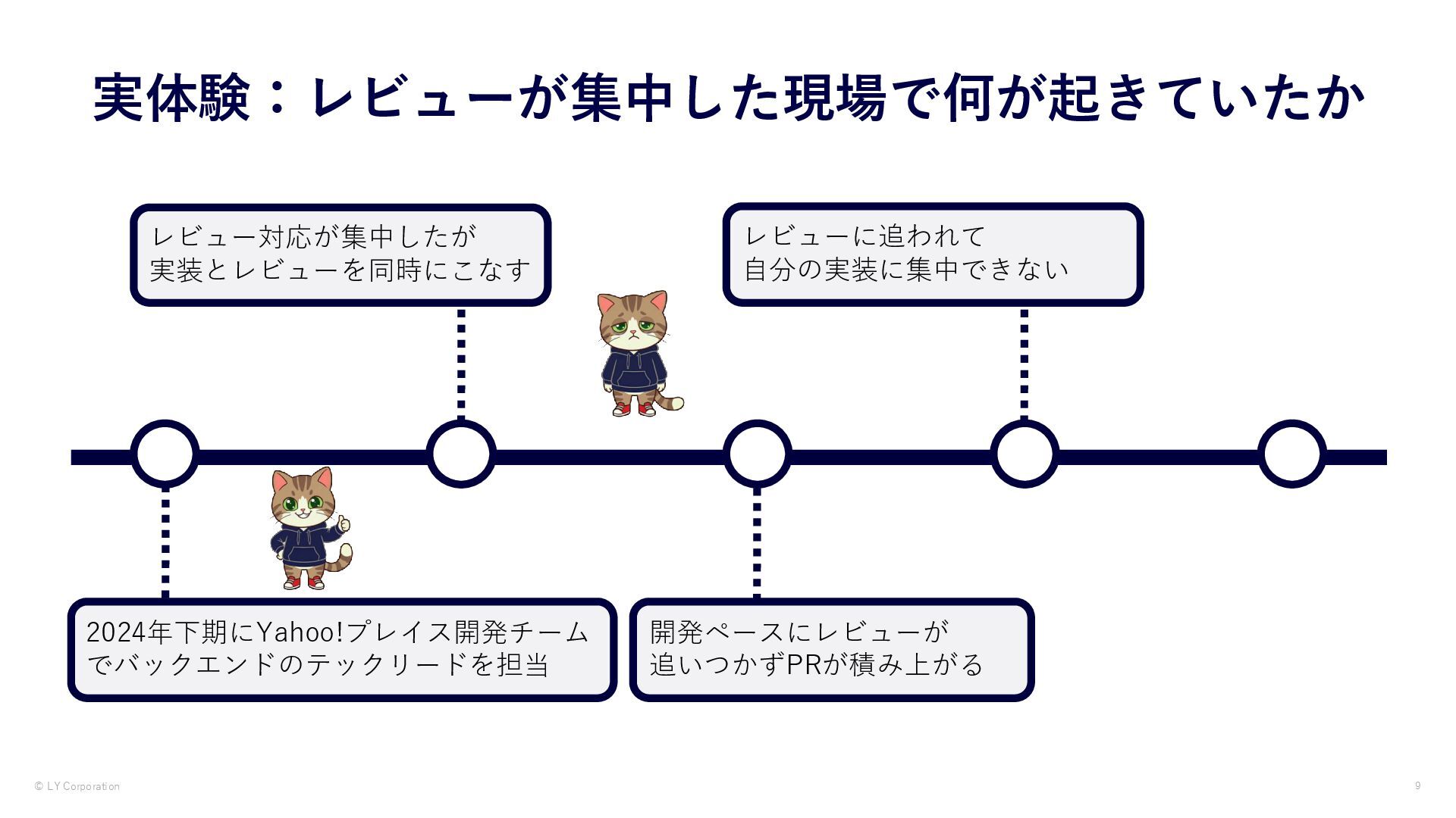 8. © LY Corporation レビュー待ちPRが滞留し、実装メンバーが次のタスクに進みづらい 一日の作業のほとんどがレビューに回り、自分のタスクが後回しになる 短時間で大きめのPRをレビューしなければならず、質の高いレビューを実施できない 01 03 02 13