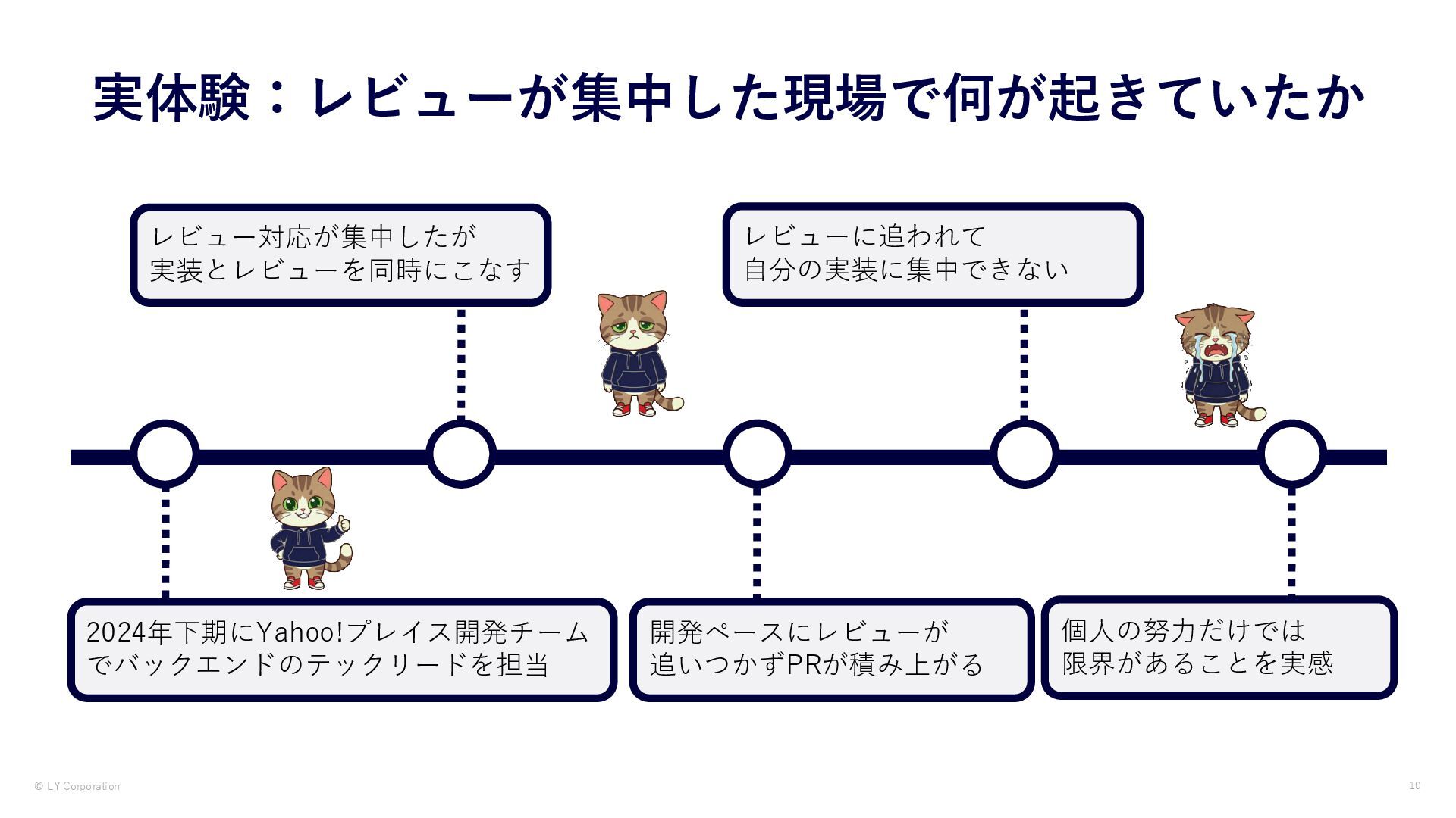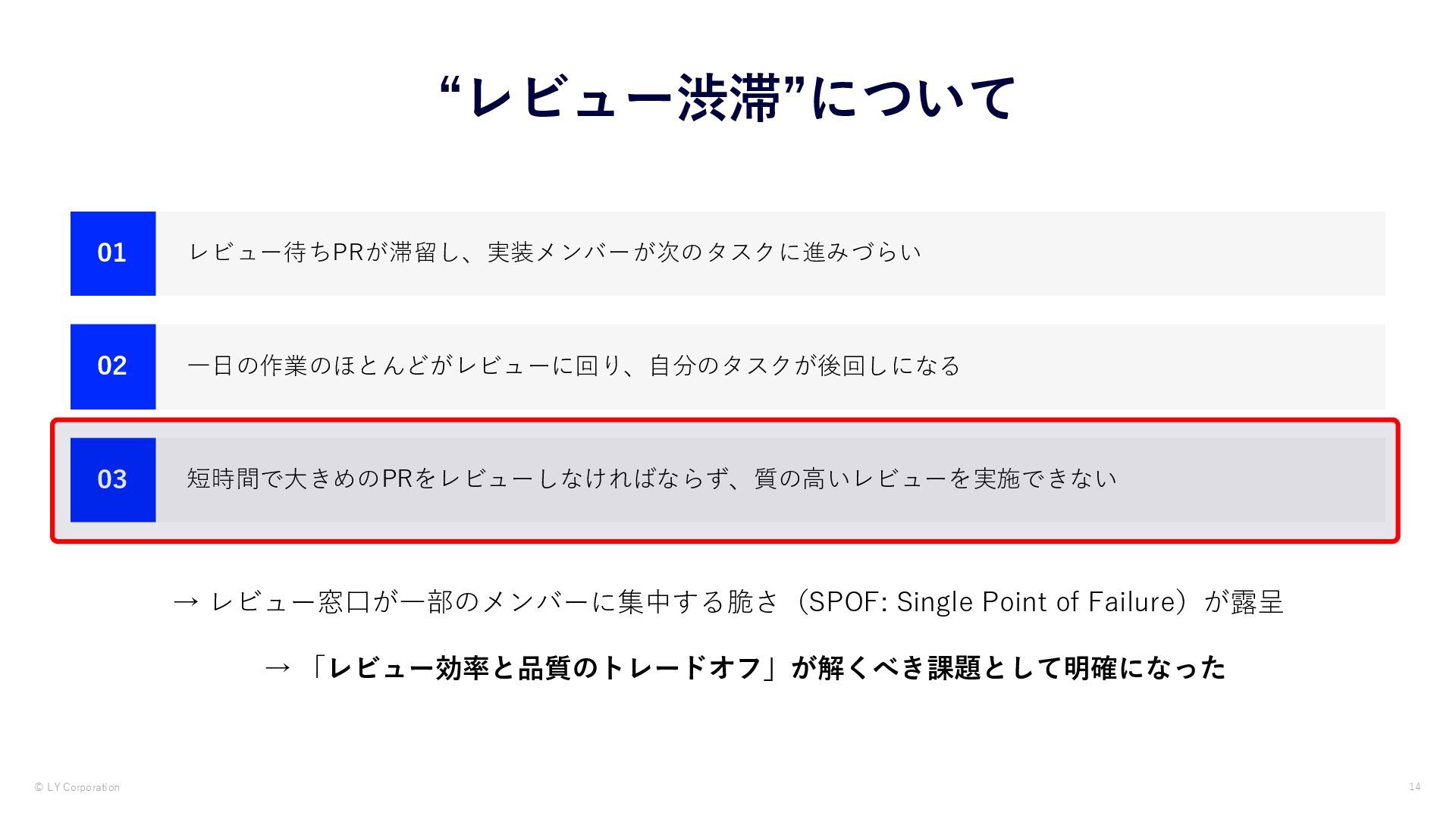 9. © LY Corporation レビュー待ちPRが滞留し、実装メンバーが次のタスクに進みづらい 一日の作業のほとんどがレビューに回り、自分のタスクが後回しになる 短時間で大きめのPRをレビューしなければならず、質の高いレビューを実施できない 01 03 02 14