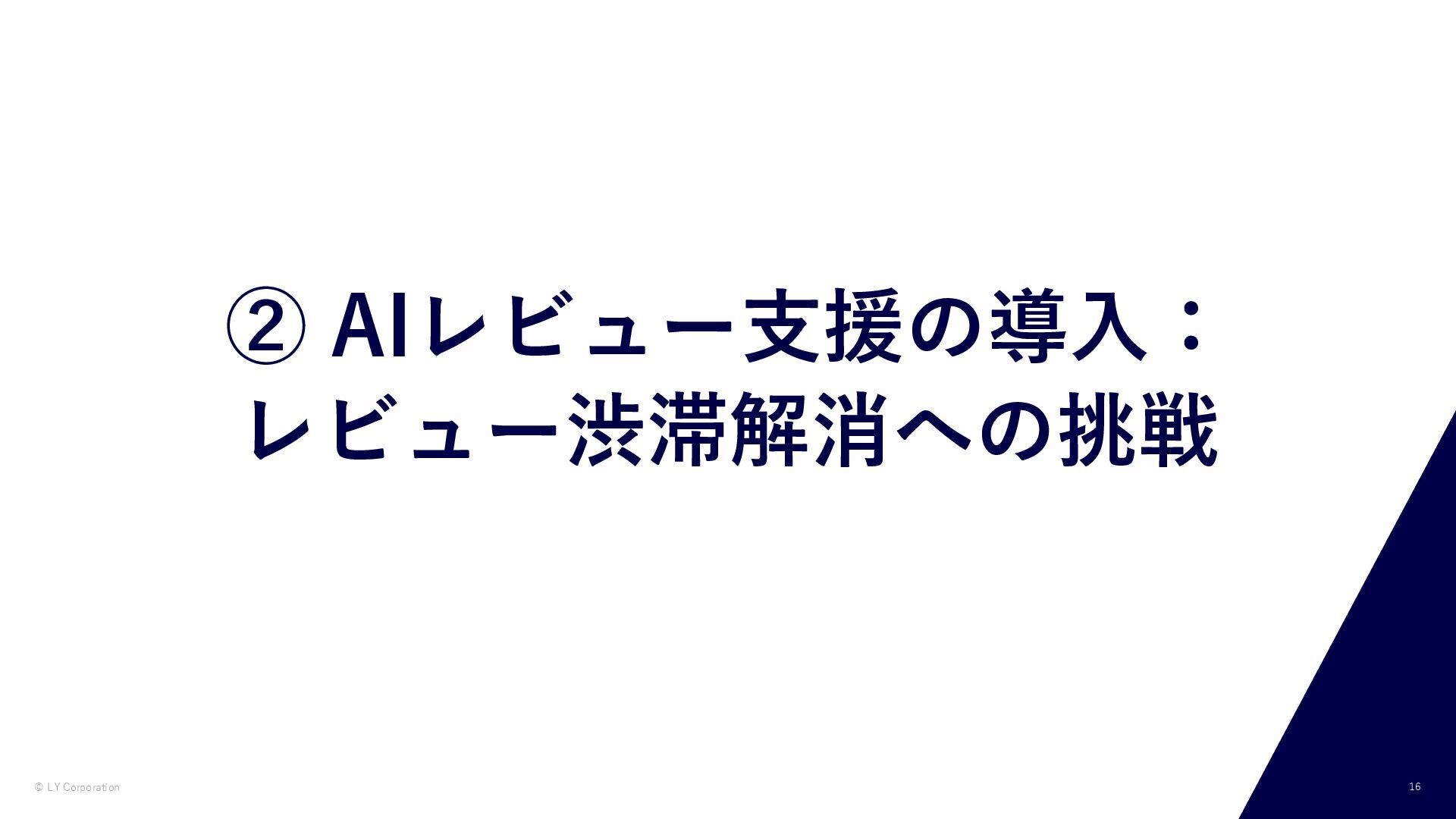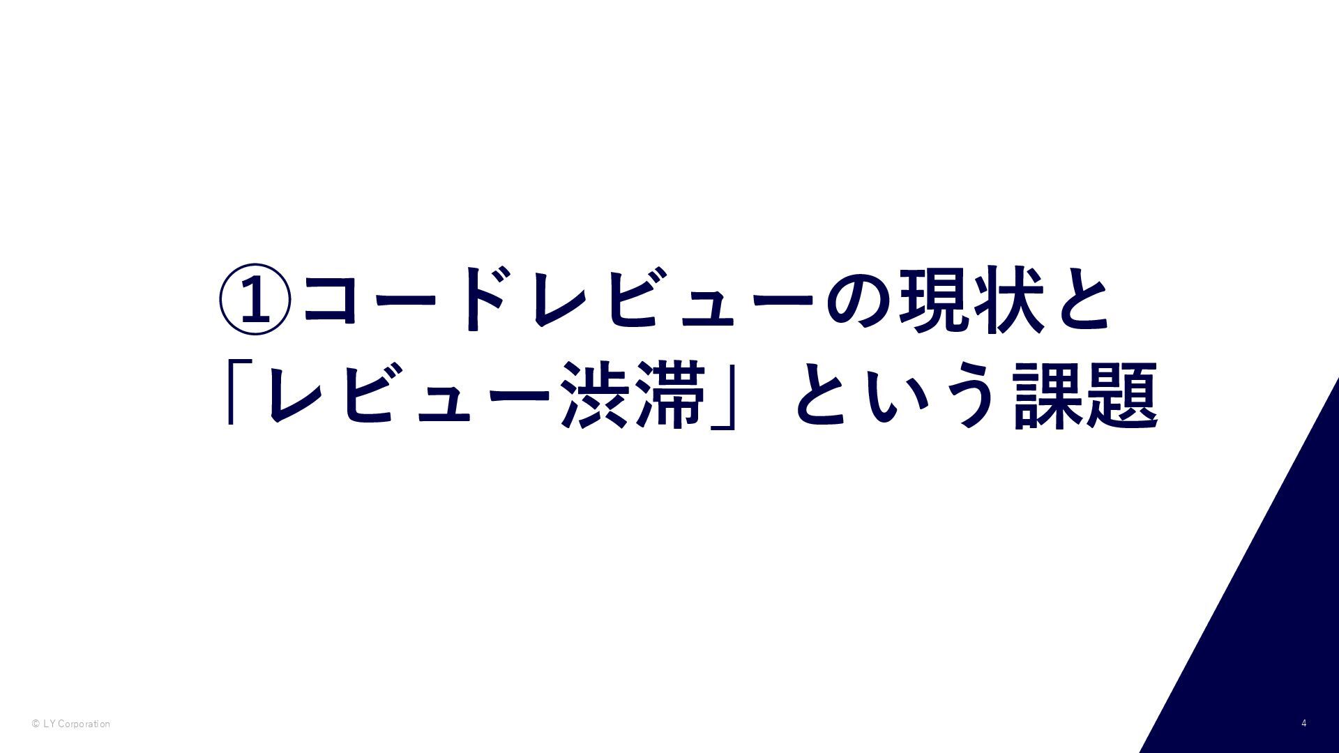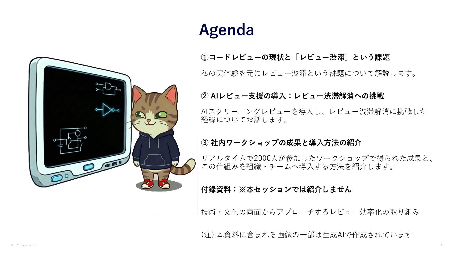 2. © LY Corporation ①コードレビューの現状と「レビュー渋滞」という課題 私の実体験を元にレビュー渋滞という課題について解説します。 ② AIレビュー支援の導入:レビュー渋滞解消への挑戦 AIスクリーニングレビューを導入し、レビュー渋滞解消に挑戦した 経緯についてお話します。 ③