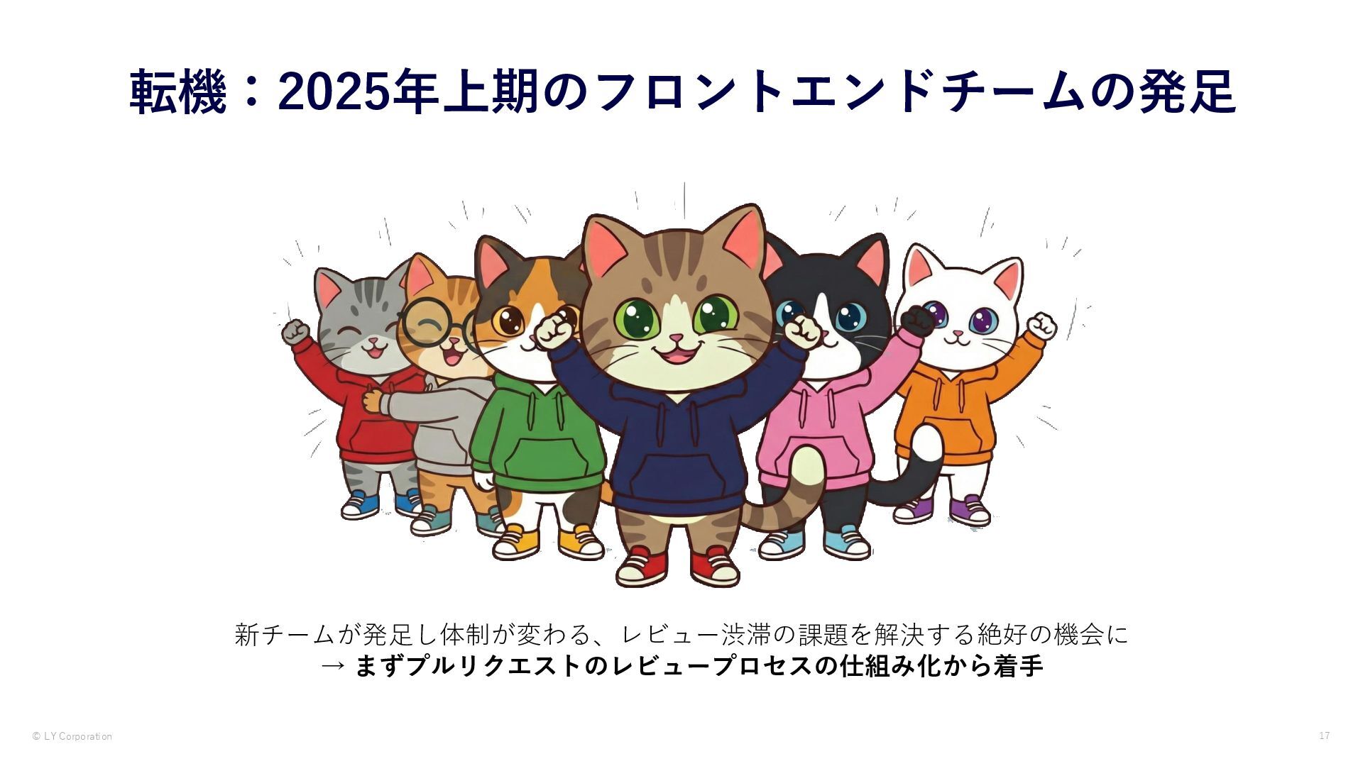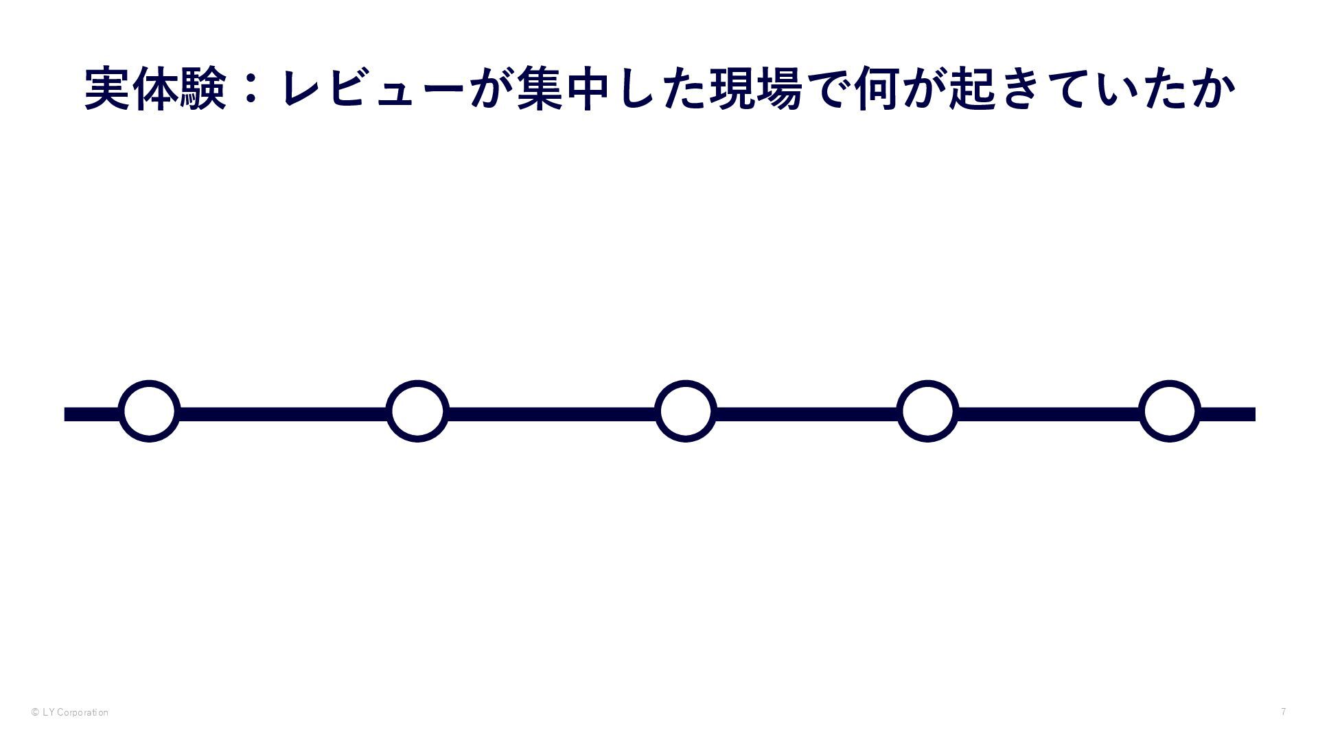 6. © LY Corporation レビュー待ちPRが滞留し、実装メンバーが次のタスクに進みづらい 一日の作業のほとんどがレビューに回り、自分のタスクが後回しになる 短時間で大きめのPRをレビューしなければならず、質の高いレビューを実施できない 01 03 02 11