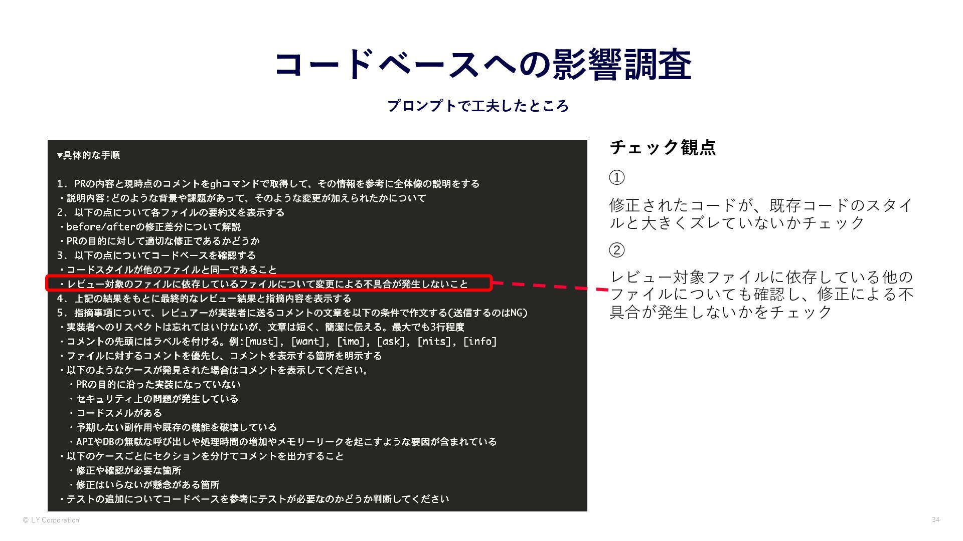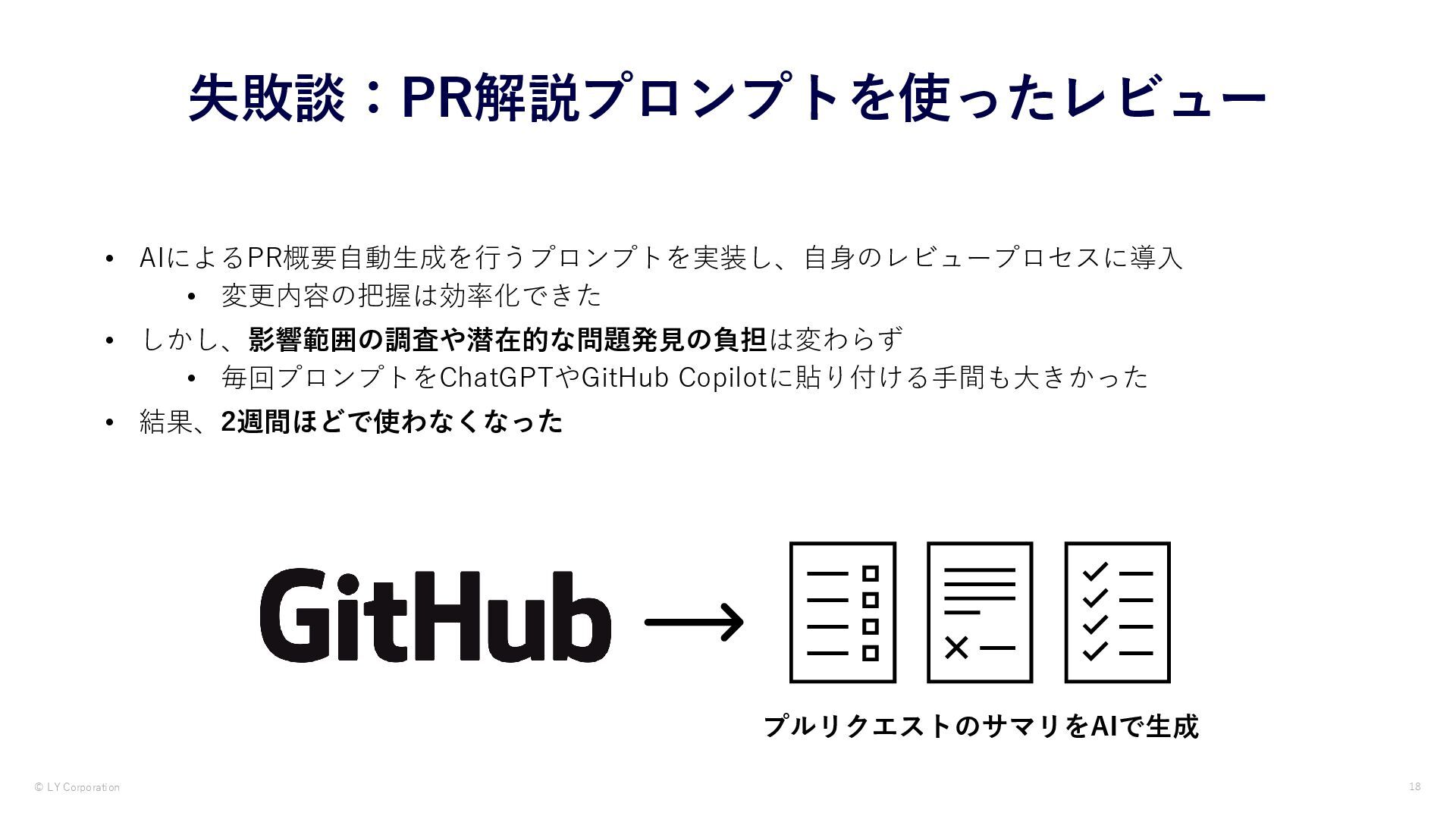 11. © LY Corporation • AIによるPR概要自動生成を行うプロンプトを実装し、自身のレビュープロセスに導入 • 変更内容の把握は効率化できた • しかし、影響範囲の調査や潜在的な問題発見の負担は変わらず •