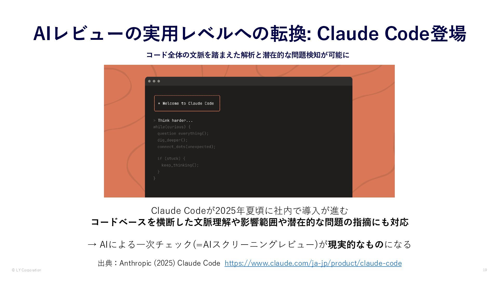 12. © LY Corporation 19 AIレビューの実用レベルへの転換: Claude Code登場 出典:Anthropic (2025) Claude