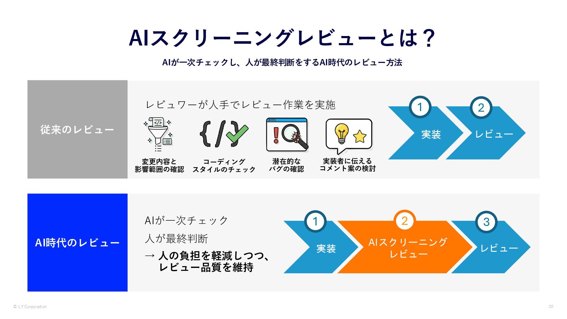 13. © LY Corporation レビュワーが人手でレビュー作業を実施 AI時代のレビュー 20 AIスクリーニングレビューとは? 従来のレビュー AIが一次チェック 人が最終判断