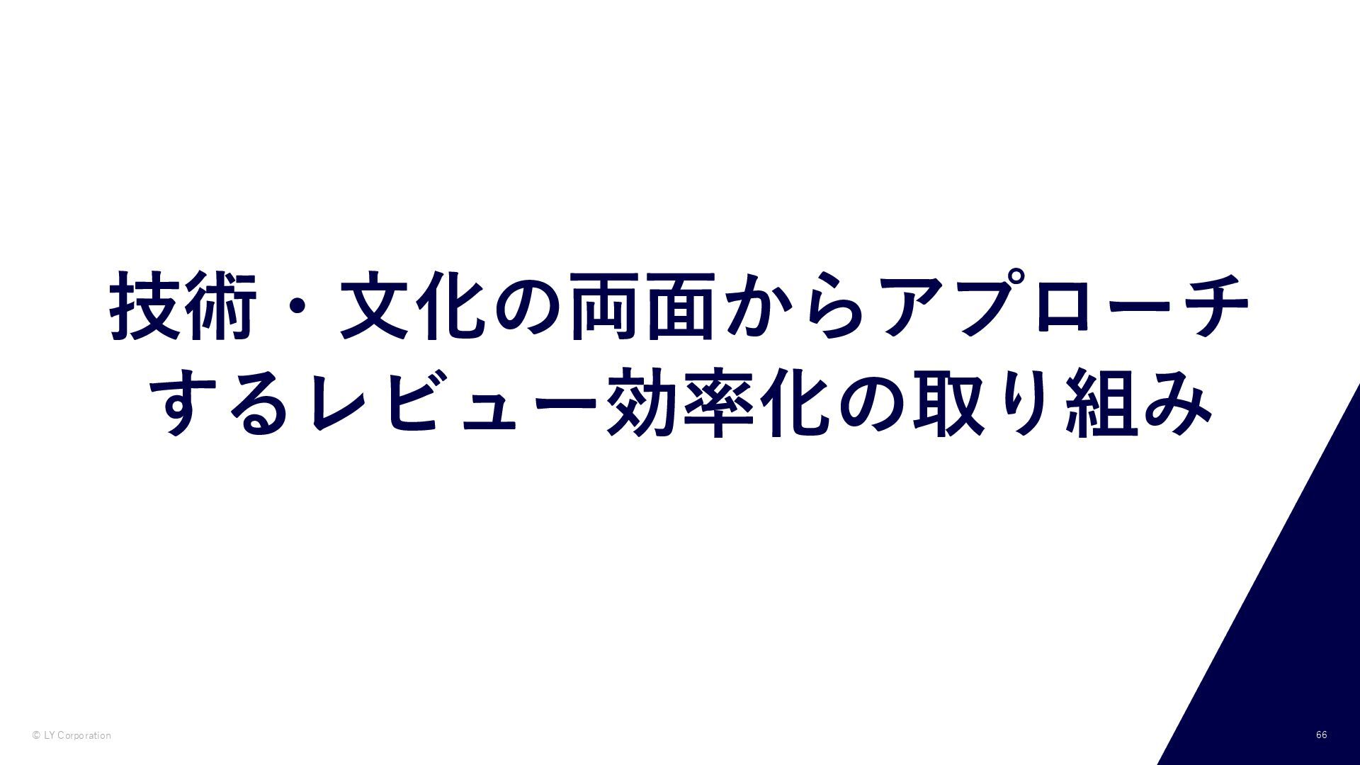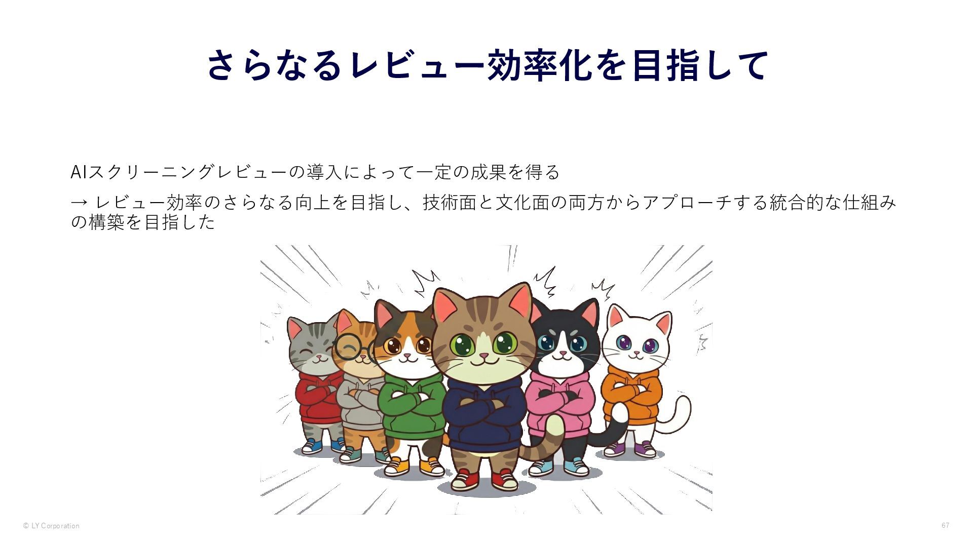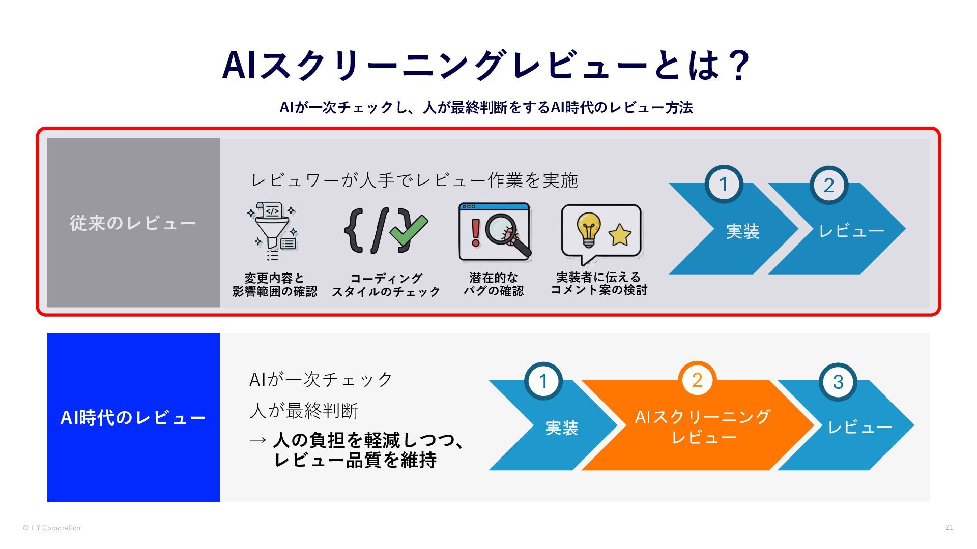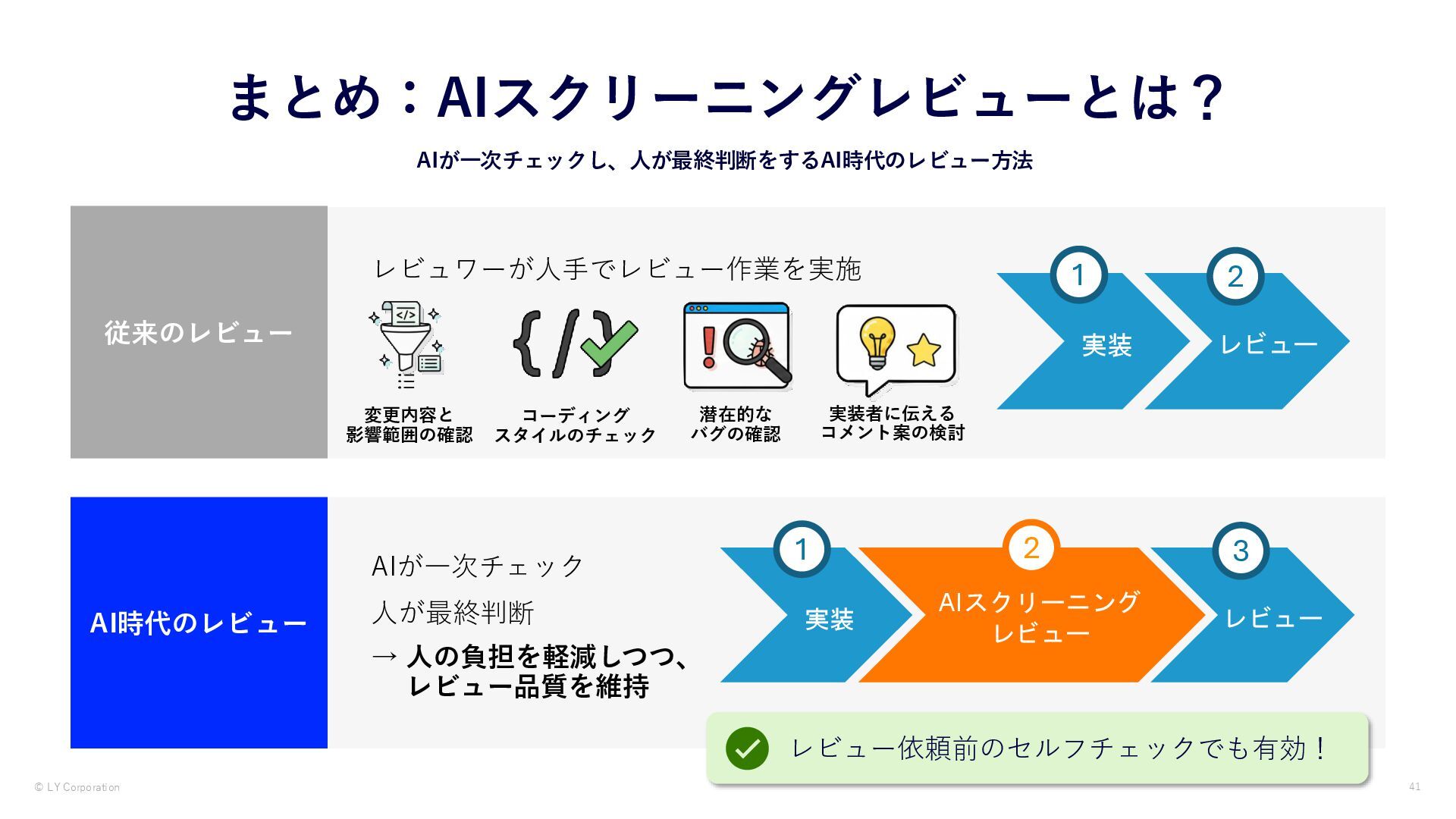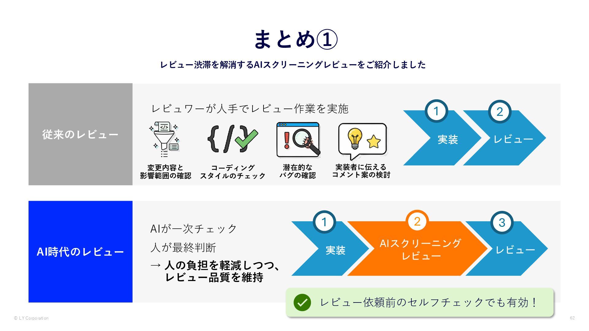 42. © LY Corporation レビュワーが人手でレビュー作業を実施 AI時代のレビュー 62 まとめ① 従来のレビュー AIが一次チェック 人が最終判断