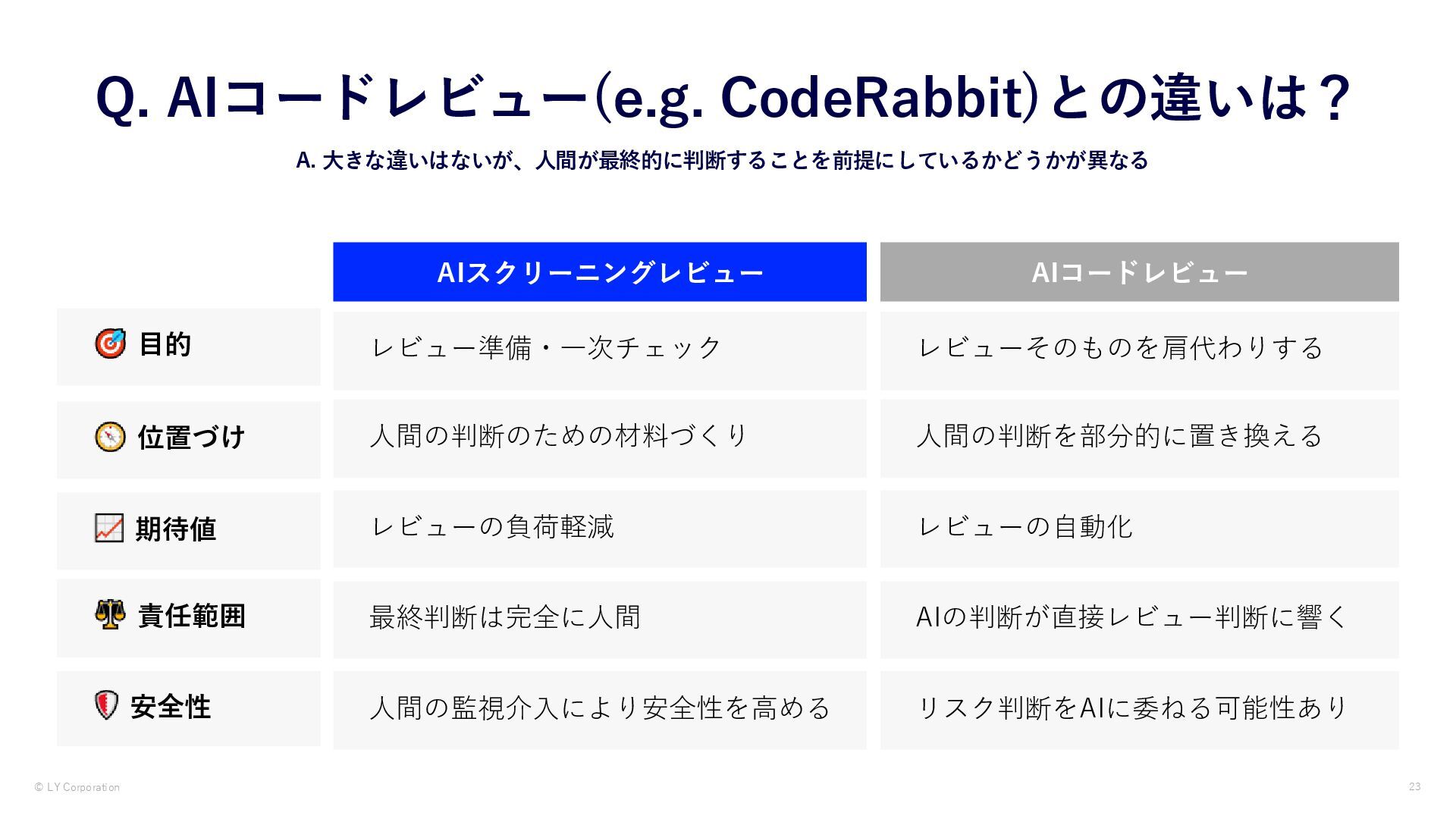 16. © LY Corporation レビュー準備・一次チェック AIスクリーニングレビュー 23 A. 大きな違いはないが、人間が最終的に判断することを前提にしているかどうかが異なる Q. AIコードレビュー(e.g.