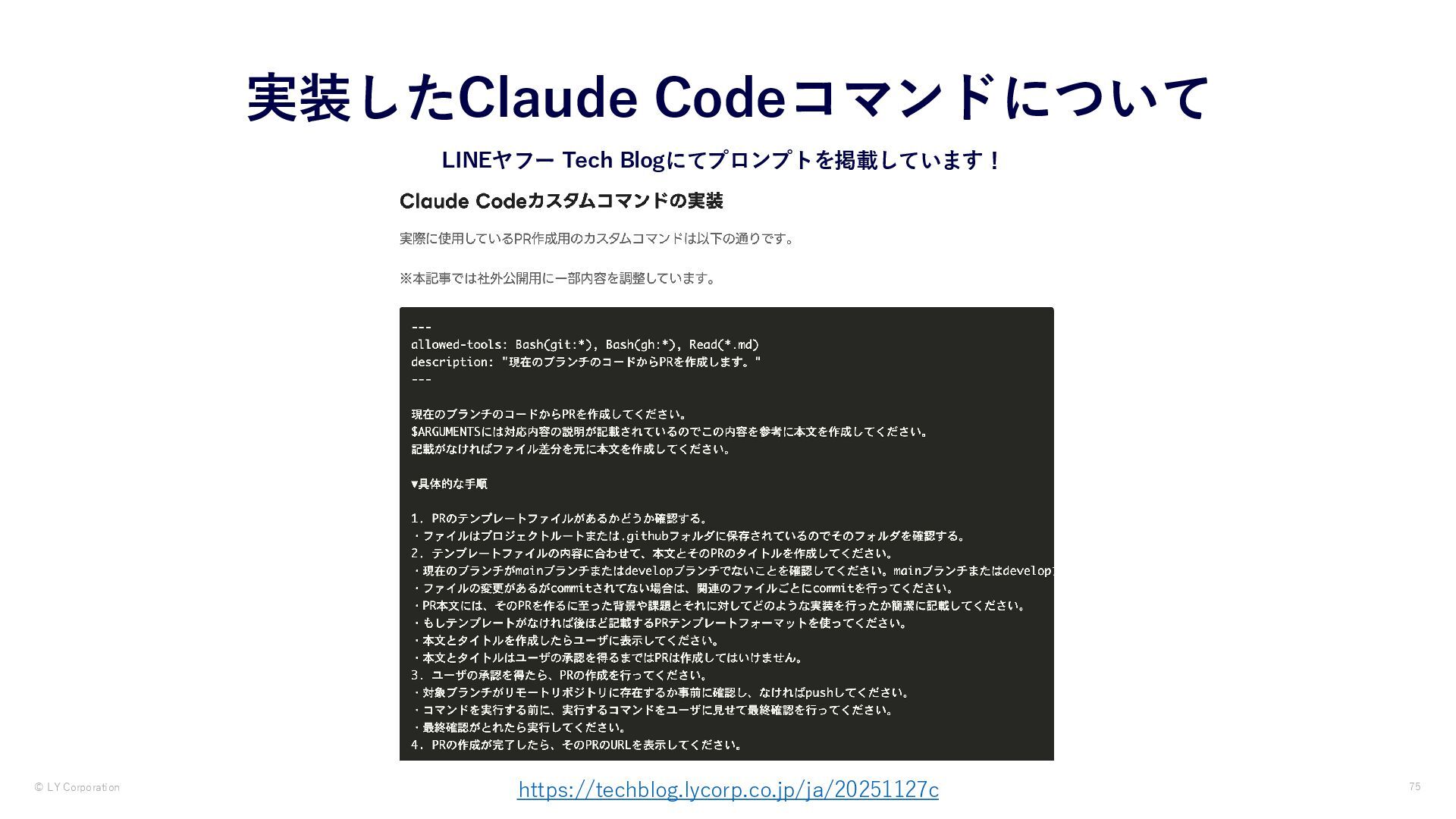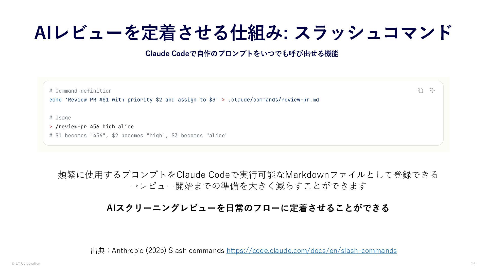 17. © LY Corporation 24 AIレビューを定着させる仕組み: スラッシュコマンド 出典:Anthropic (2025) Slash commands