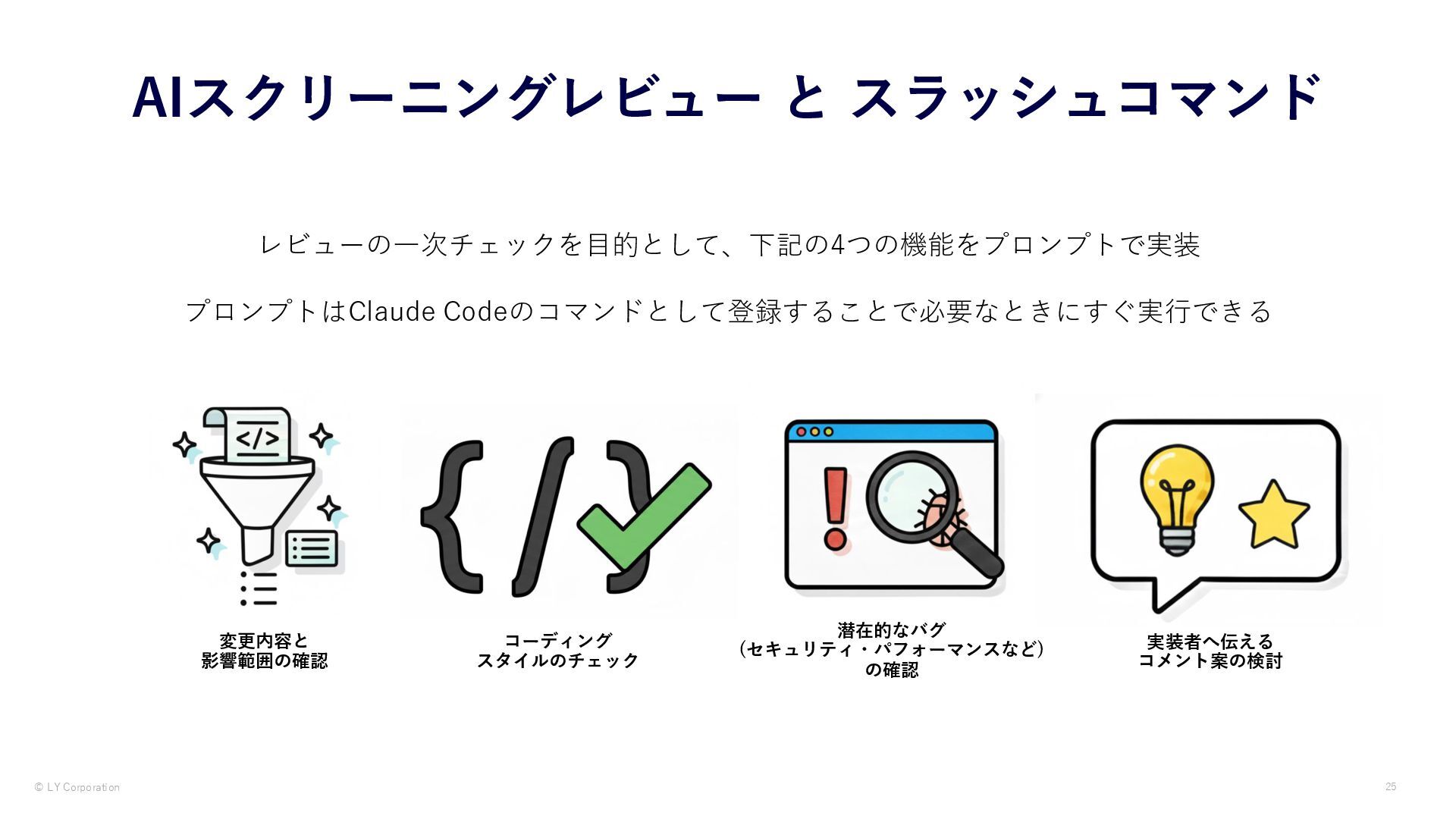 18. © LY Corporation 25 AIスクリーニングレビュー と スラッシュコマンド 変更内容と 影響範囲の確認 コーディング