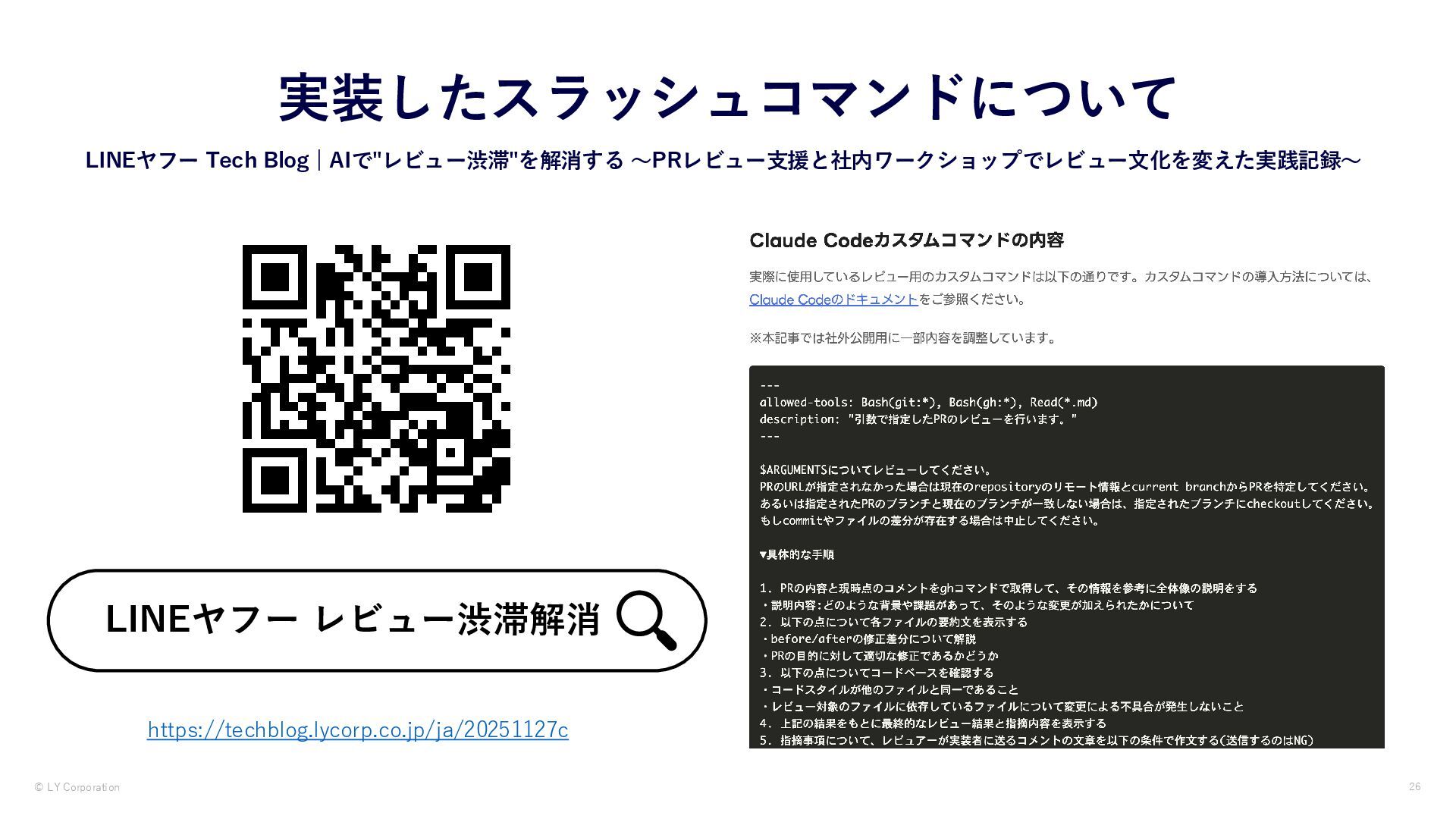 19. © LY Corporation 26 実装したスラッシュコマンドについて LINEヤフー Tech Blog | AIで"レビュー渋滞"を解消する