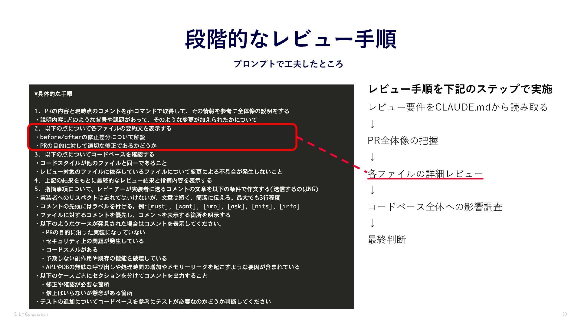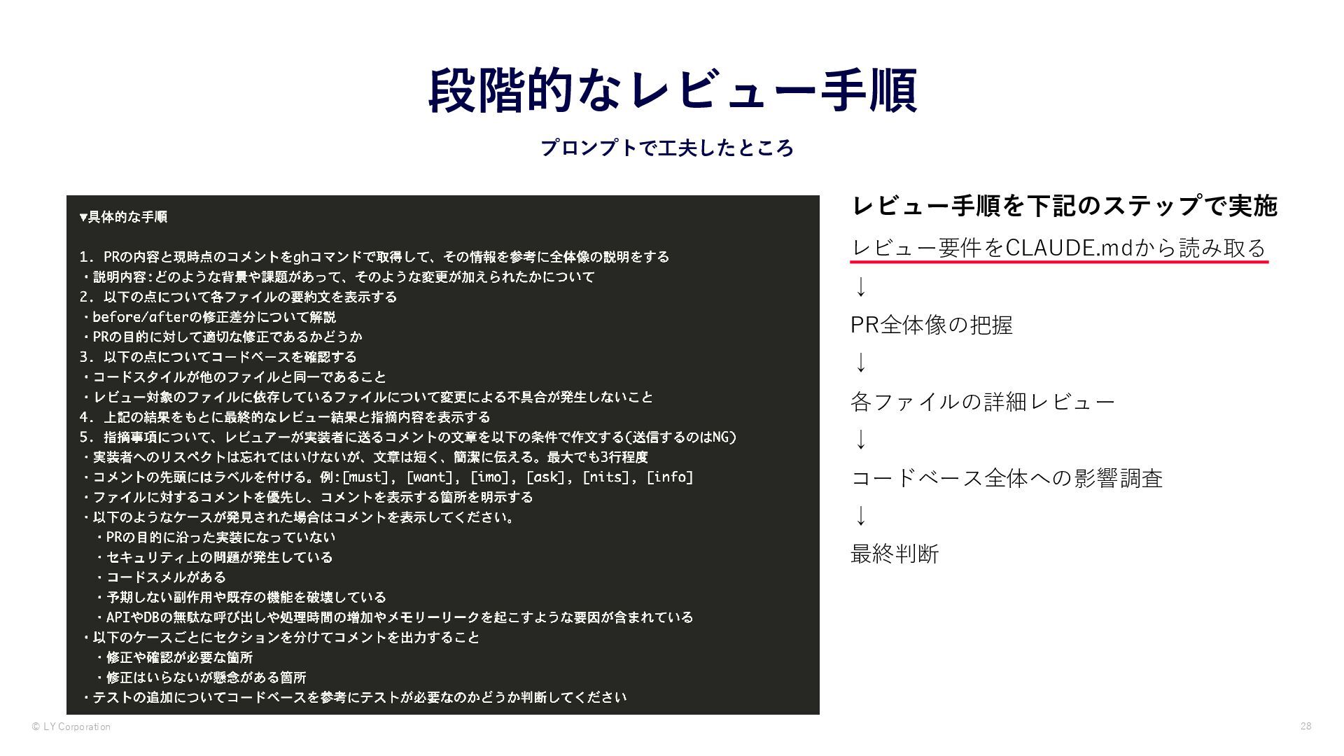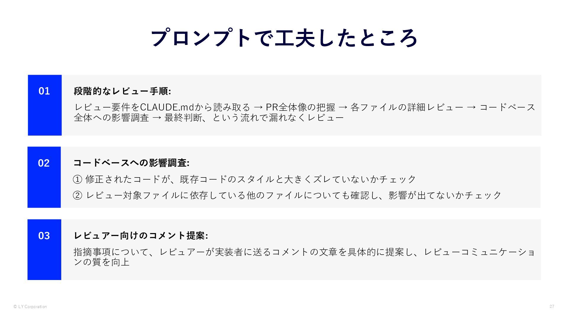 26. © LY Corporation 段階的なレビュー手順: レビュー要件をCLAUDE.mdから読み取る → PR全体像の把握 → 各ファイルの詳細レビュー →