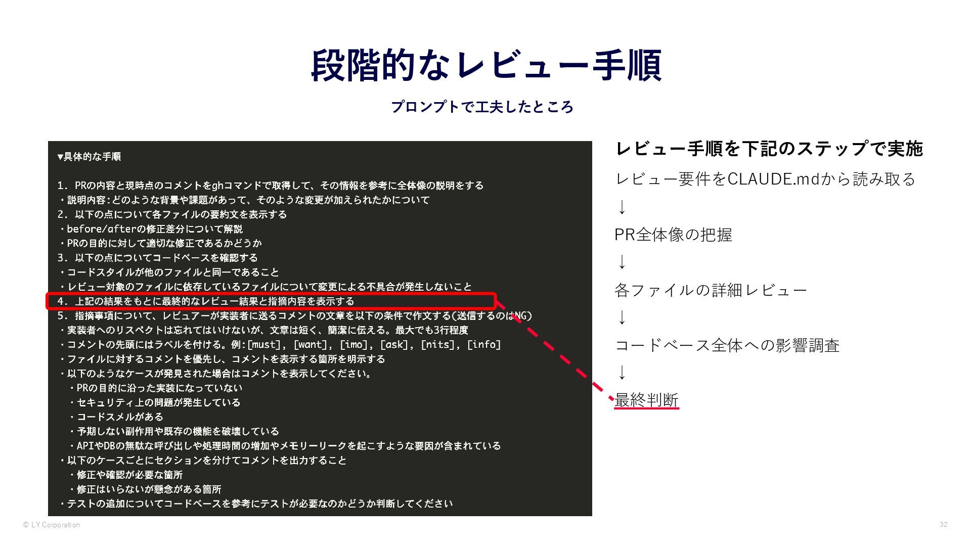 21. © LY Corporation レビュー手順を下記のステップで実施 レビュー要件をCLAUDE.mdから読み取る ↓ PR全体像の把握 ↓ 各ファイルの詳細レビュー ↓