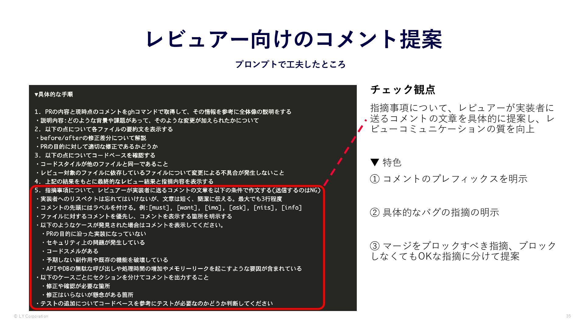 23. © LY Corporation チェック観点 指摘事項について、レビュアーが実装者に 送るコメントの文章を具体的に提案し、レ ビューコミュニケーションの質を向上 ▼ 特色 ①