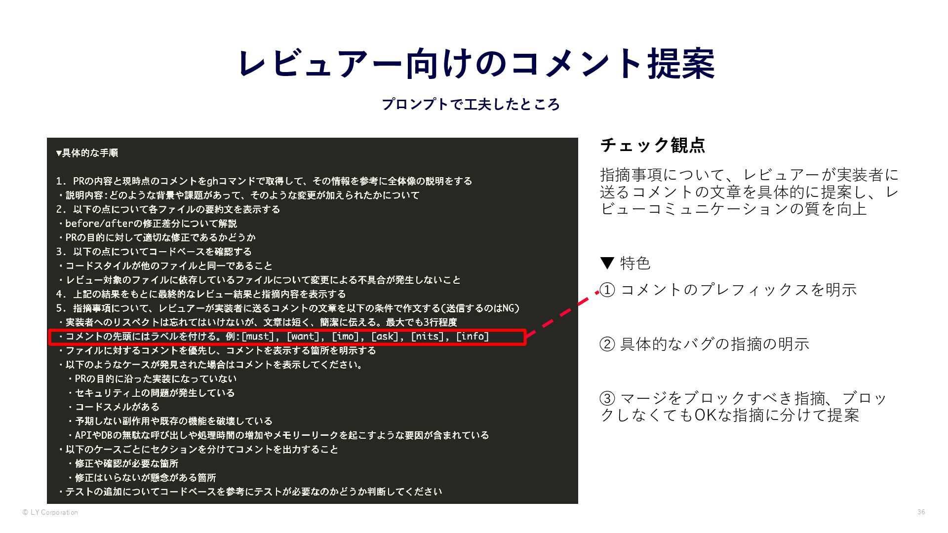 コメントのプレフィックスを明示 ② 具体的なバグの指摘の明示 ③ マージをブロックすべき指摘、ブロック しなくてもOKな指摘に分けて提案 35 プロンプトで工夫したところ レビュアー向けのコメント提案