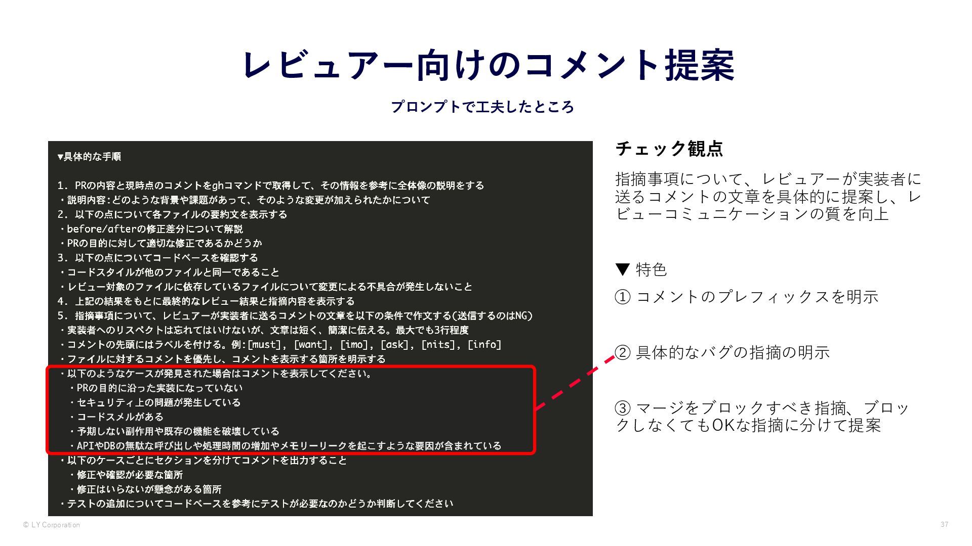 コメントのプレフィックスを明示 ② 具体的なバグの指摘の明示 ③ マージをブロックすべき指摘、ブロッ クしなくてもOKな指摘に分けて提案 36 プロンプトで工夫したところ レビュアー向けのコメント提案