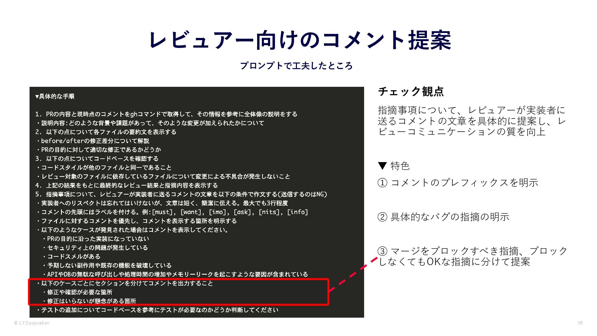 コメントのプレフィックスを明示 ② 具体的なバグの指摘の明示 ③ マージをブロックすべき指摘、ブロッ クしなくてもOKな指摘に分けて提案 37 プロンプトで工夫したところ レビュアー向けのコメント提案