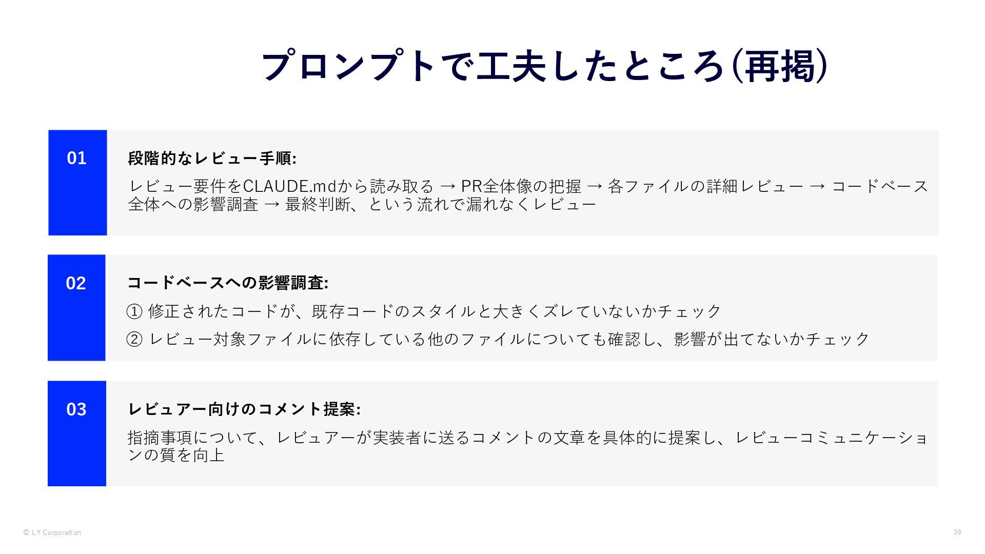 コードベース 全体への影響調査 → 最終判断、という流れで漏れなくレビュー コードベースへの影響調査: ① 修正されたコードが、既存コードのスタイルと大きくズレていないかチェック ② レビュー対象ファイルに依存している他のファイルについても確認し、影響が出てないかチェック レビュアー向けのコメント提案: 指摘事項について、レビュアーが実装者に送るコメントの文章を具体的に提案し、レビューコミュニケーショ ンの質を向上 01 03 02 39 プロンプトで工夫したところ(再掲)