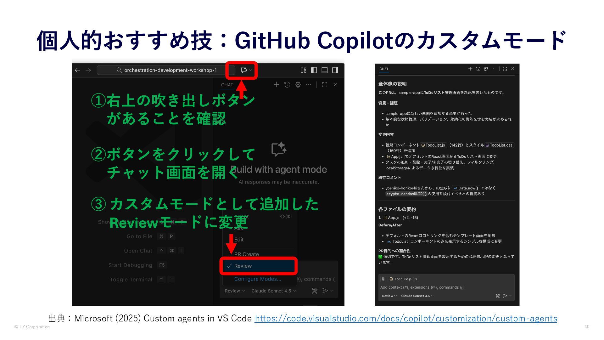 27. © LY Corporation 40 個人的おすすめ技:GitHub Copilotのカスタムモード 出典:Microsoft (2025) Custom agents