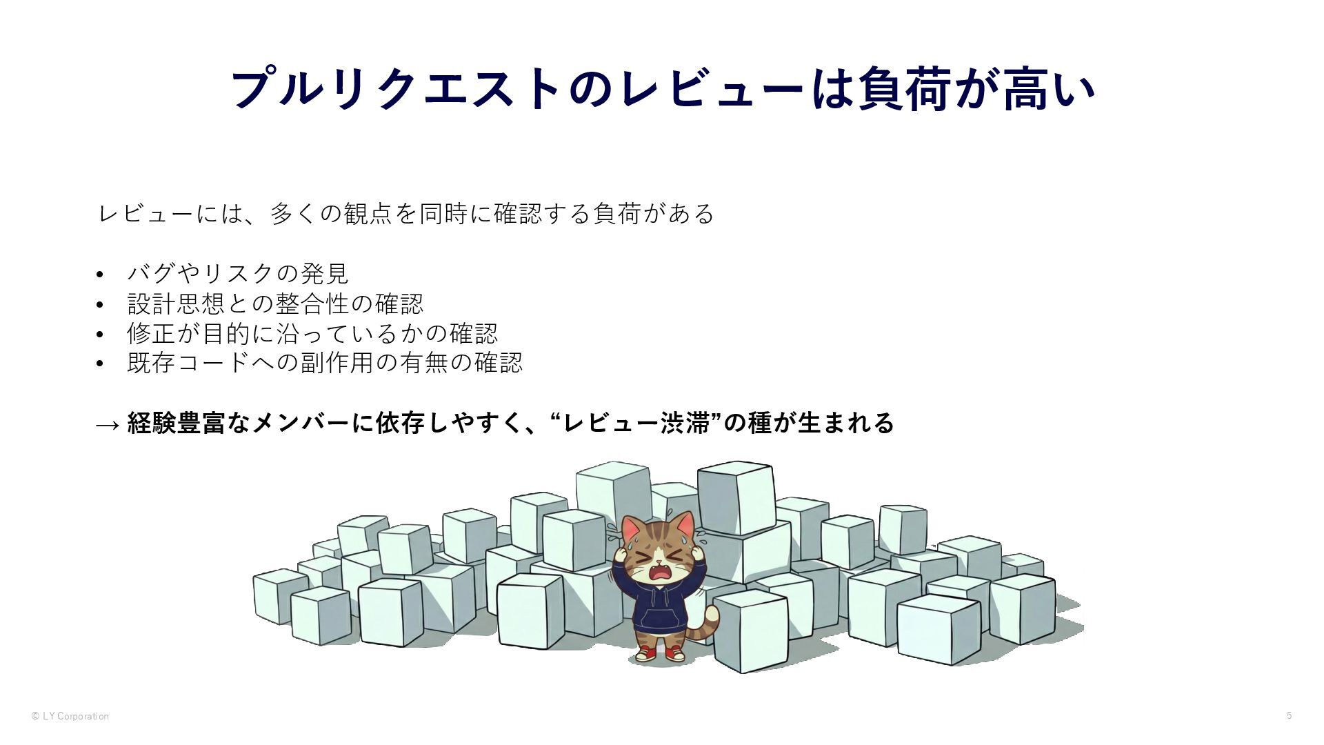 3. © LY Corporation レビューには、多くの観点を同時に確認する負荷がある • バグやリスクの発見 • 設計思想との整合性の確認 • 修正が目的に沿っているかの確認