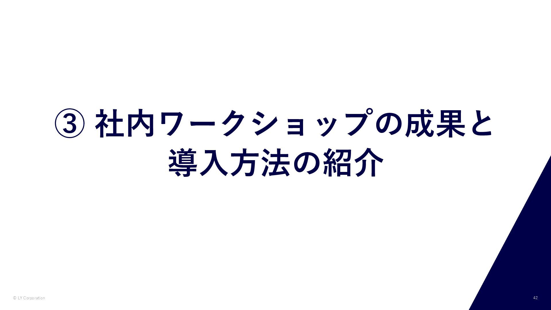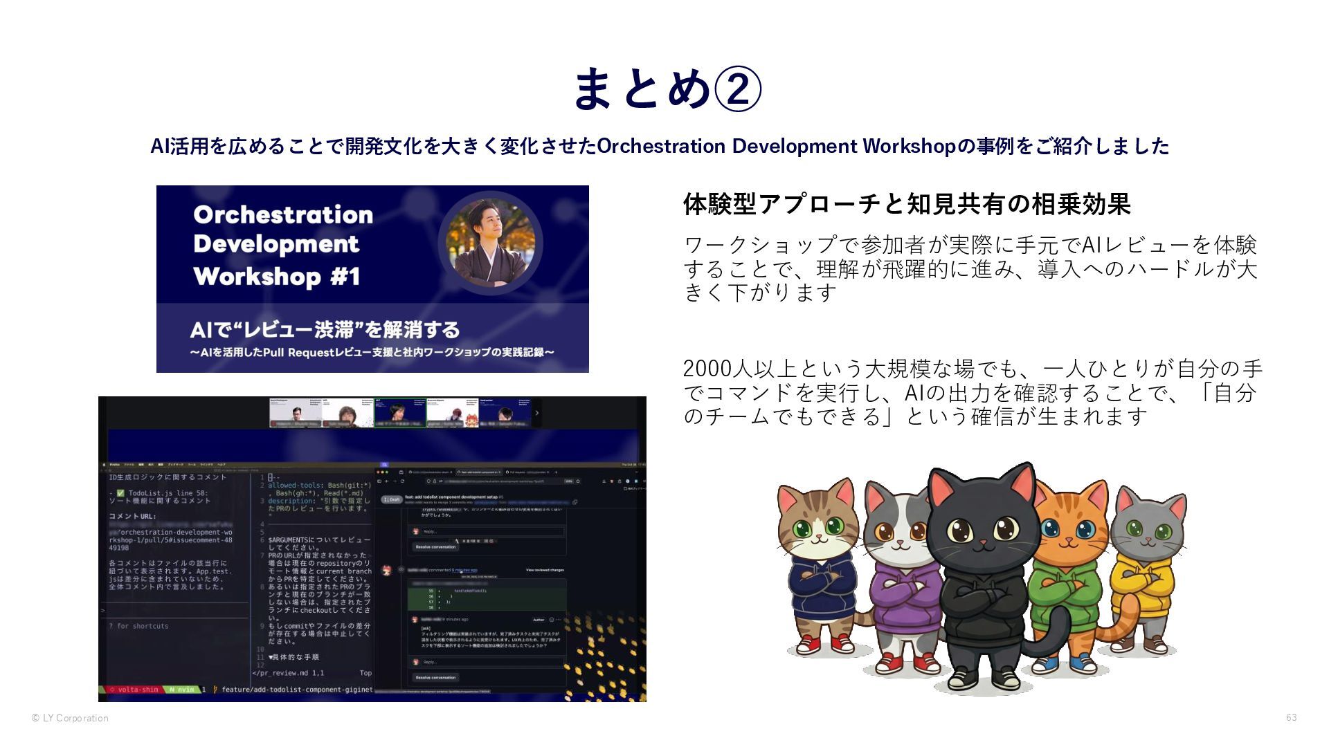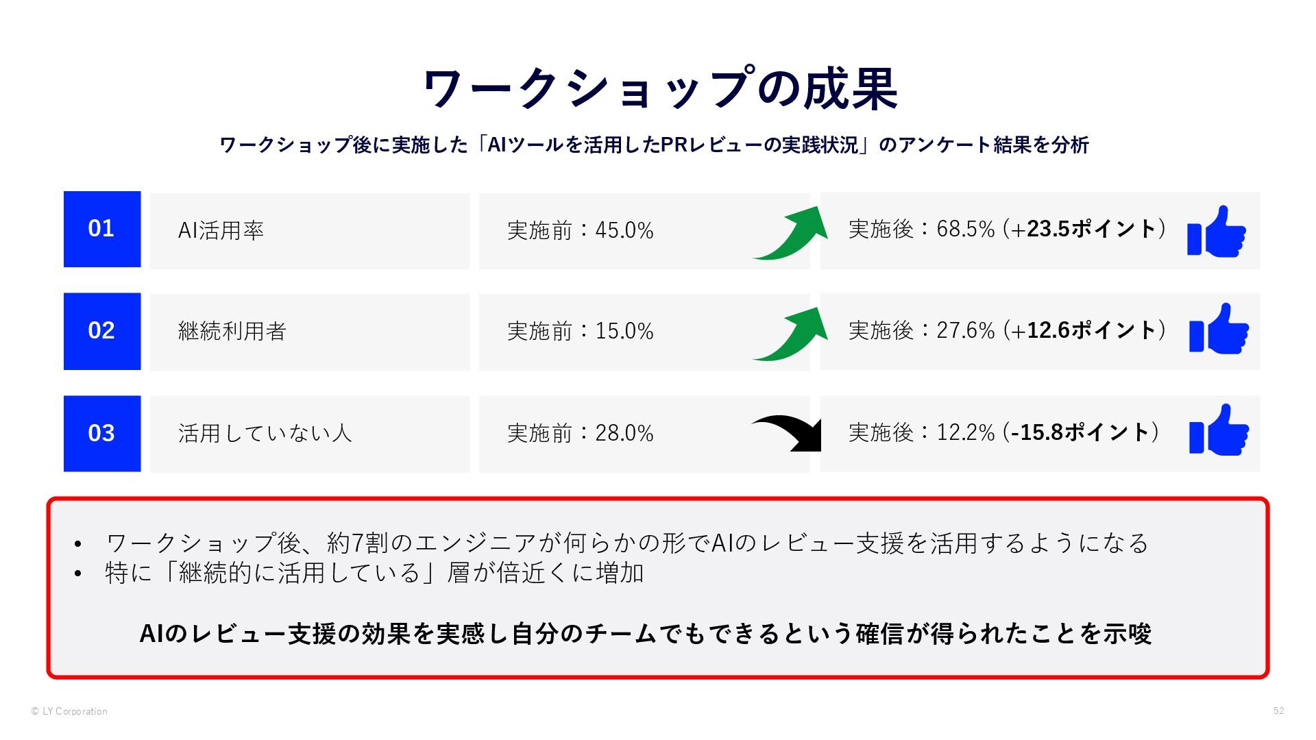 33. © LY Corporation AI活用率 52 ワークショップ後に実施した「AIツールを活用したPRレビューの実践状況」のアンケート結果を分析 ワークショップの成果 実施後:68.5% (+23.5ポイント) 実施前:45.0%