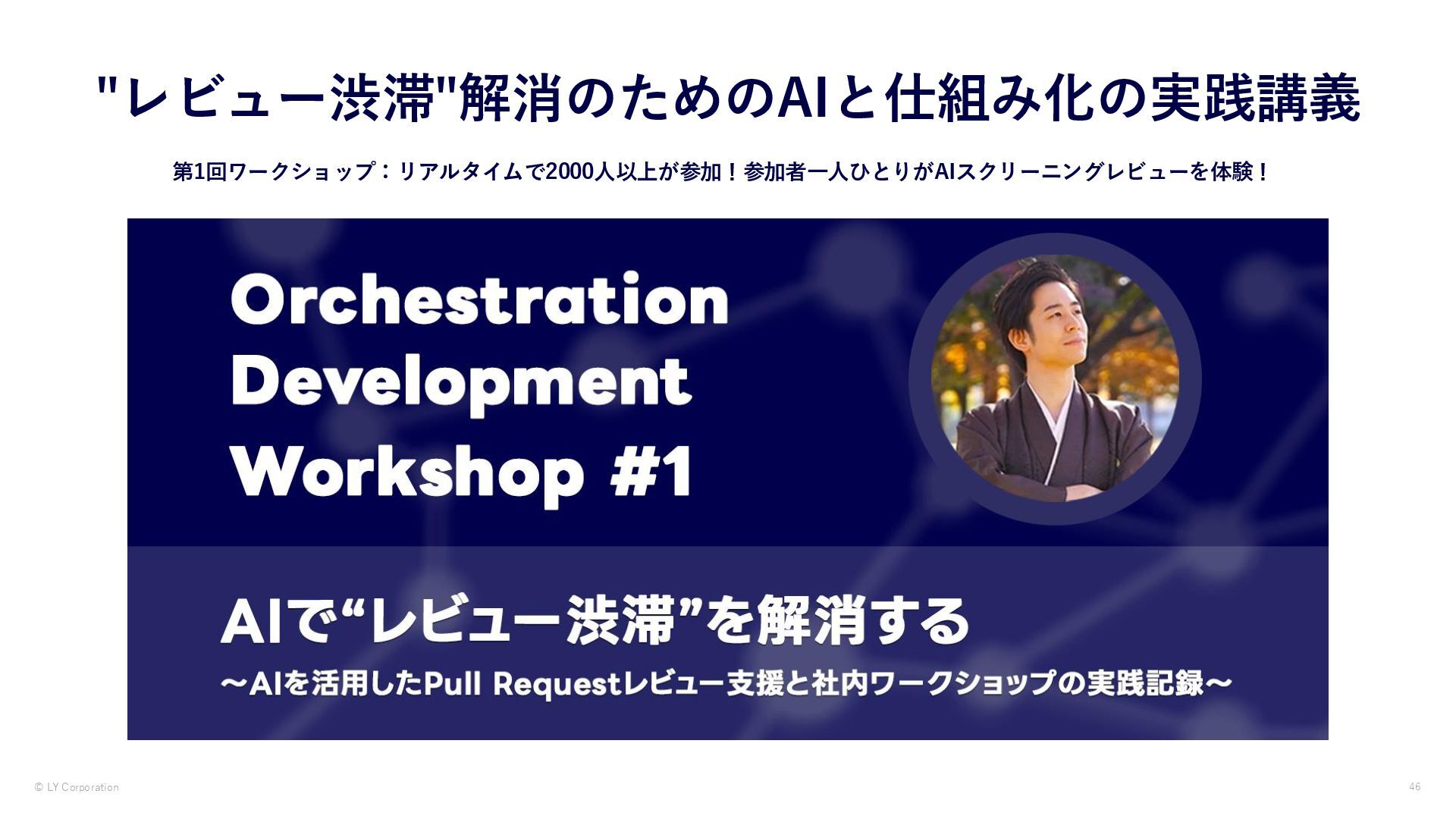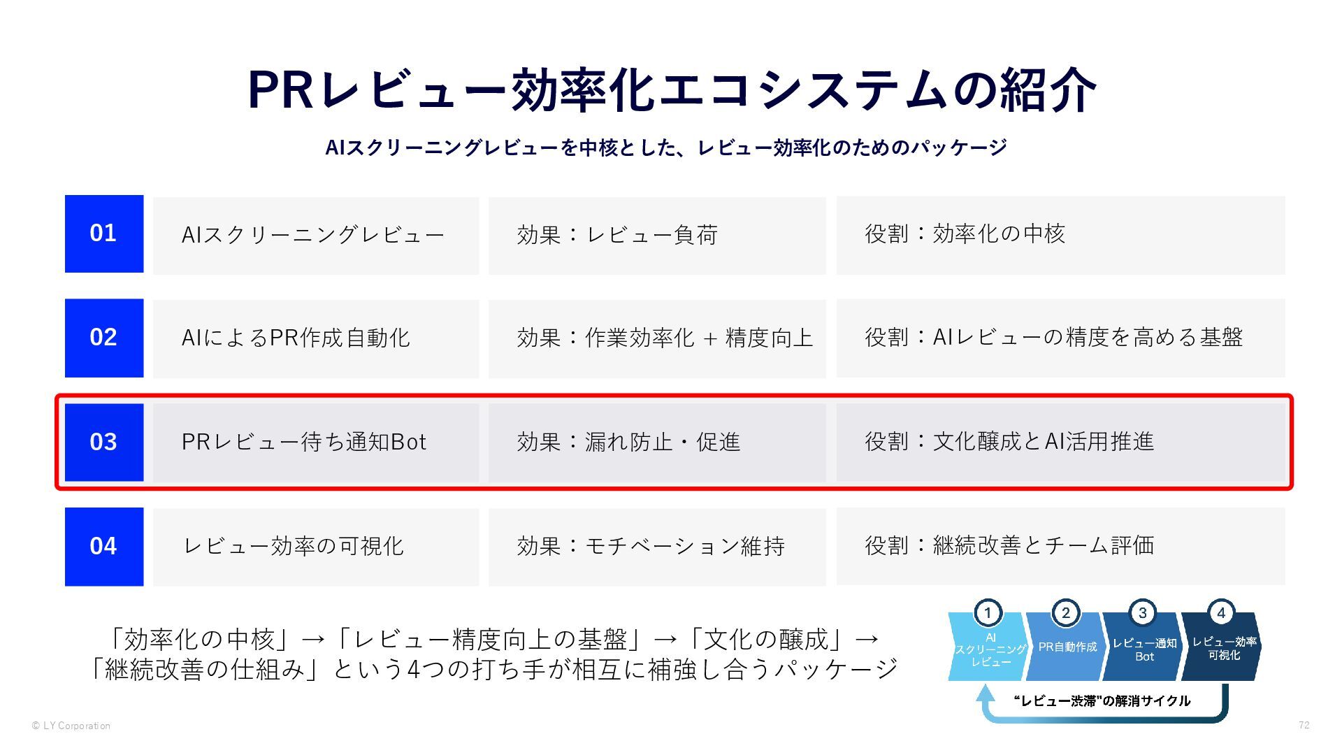 46. © LY Corporation AIスクリーニングレビュー 72 PRレビュー効率化エコシステムの紹介 役割:効率化の中核 効果:レビュー負荷 02 01