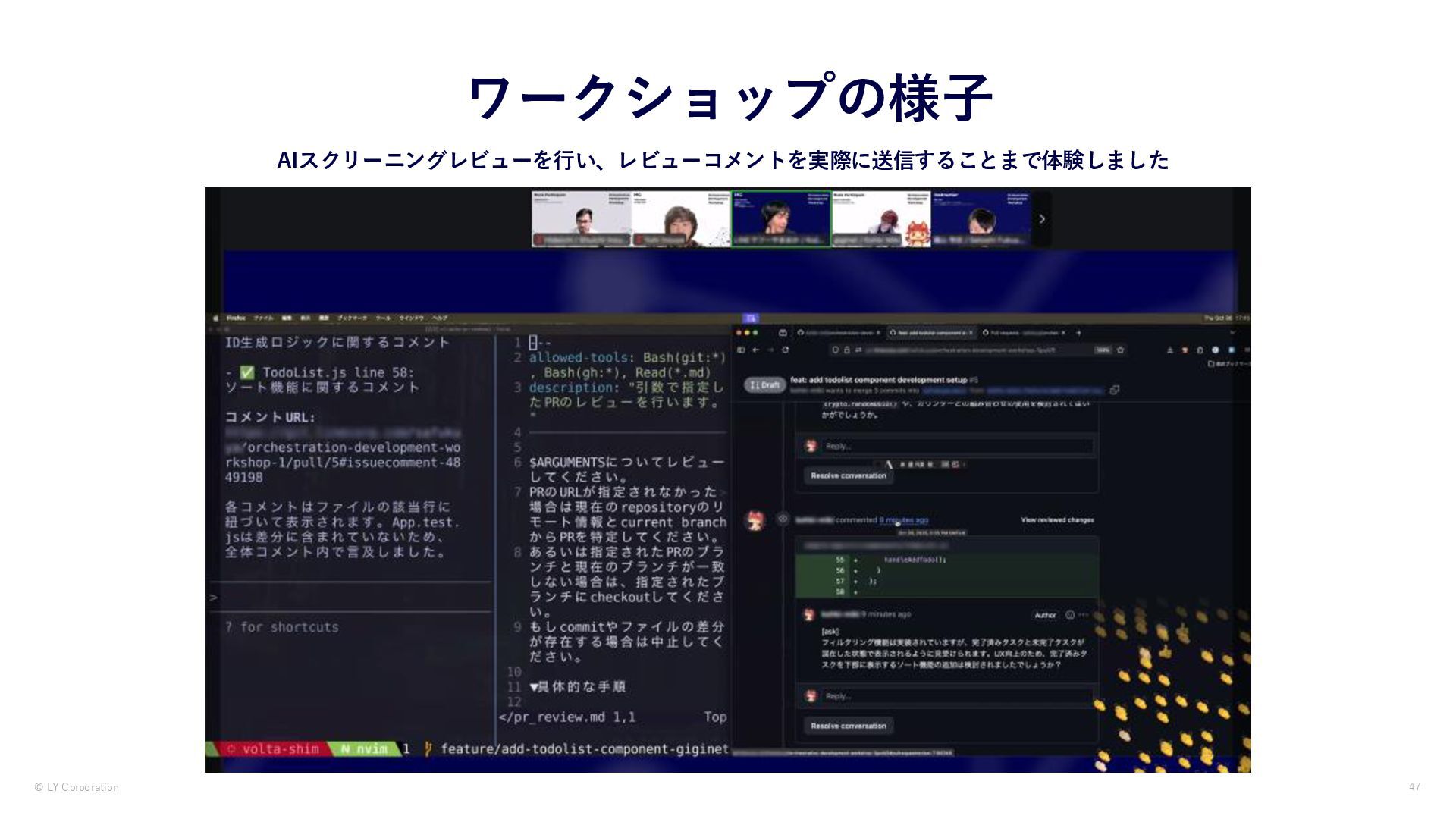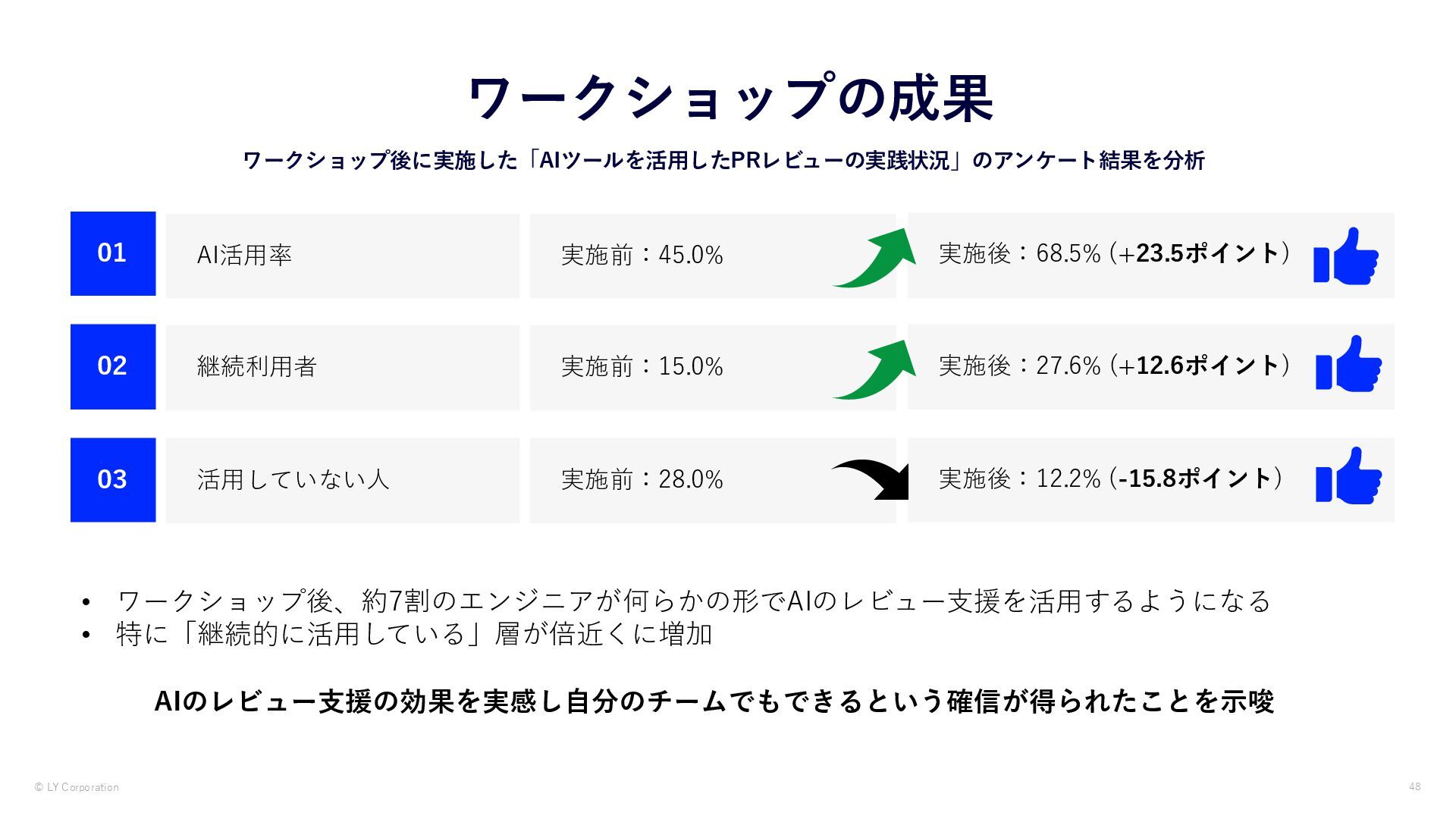 29. © LY Corporation AI活用率 48 ワークショップ後に実施した「AIツールを活用したPRレビューの実践状況」のアンケート結果を分析 ワークショップの成果 実施後:68.5% (+23.5ポイント) 実施前:45.0%
