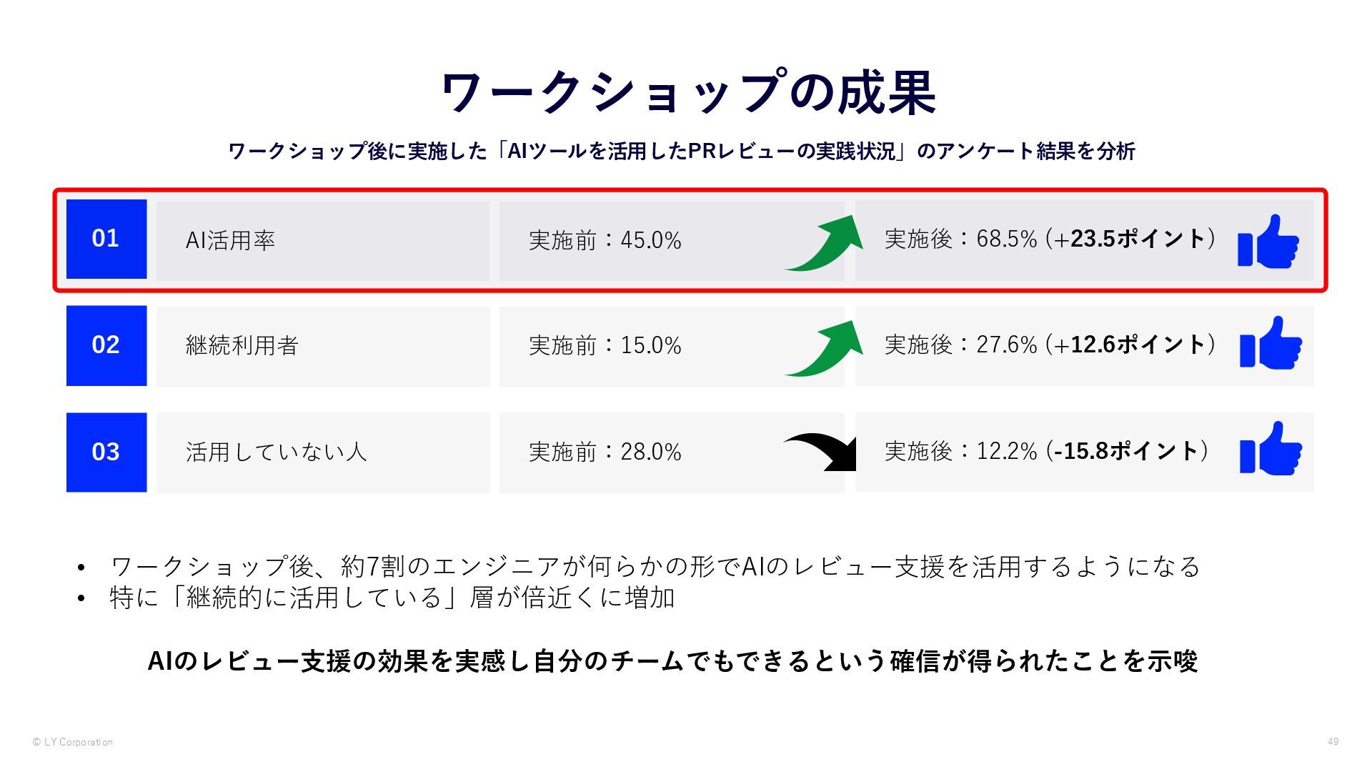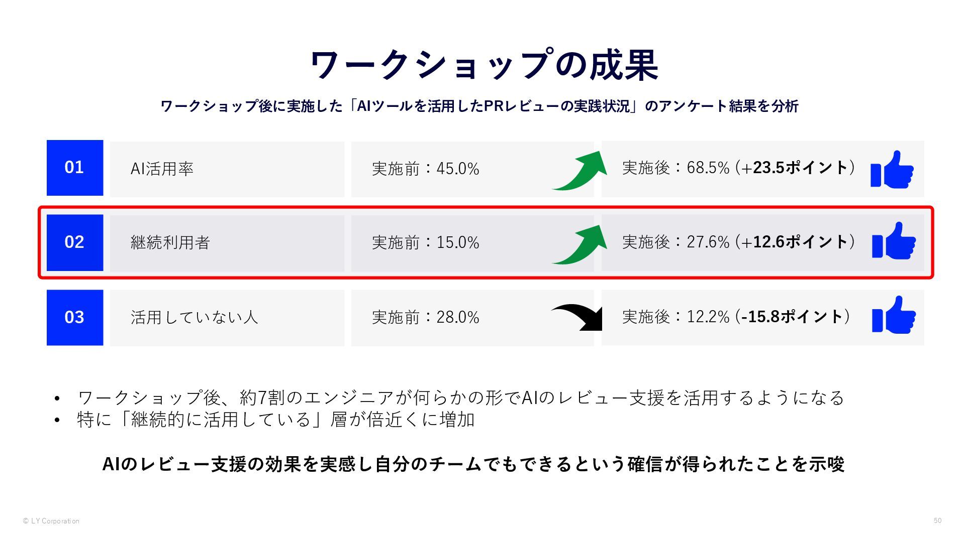 30. © LY Corporation AI活用率 49 ワークショップ後に実施した「AIツールを活用したPRレビューの実践状況」のアンケート結果を分析 ワークショップの成果 実施後:68.5% (+23.5ポイント) 実施前:45.0%