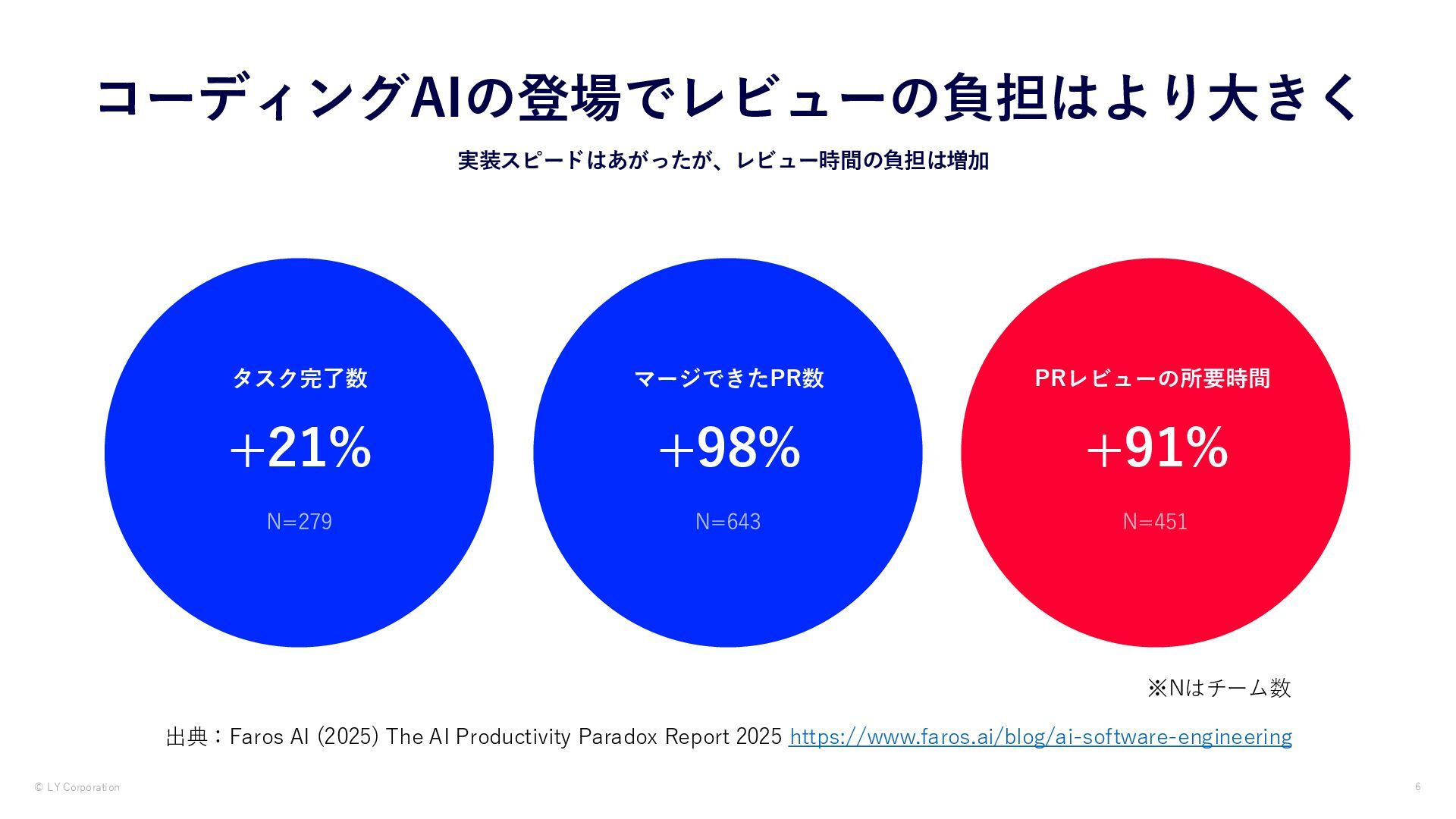 実装スピードはあがったが、レビュー時間の負担は増加 コーディングAIの登場でレビューの負担はより大きく 出典:Faros AI (2025) The AI Productivity Paradox Report 2025 https://www.faros.ai/blog/ai-software-engineering ※Nはチーム数
