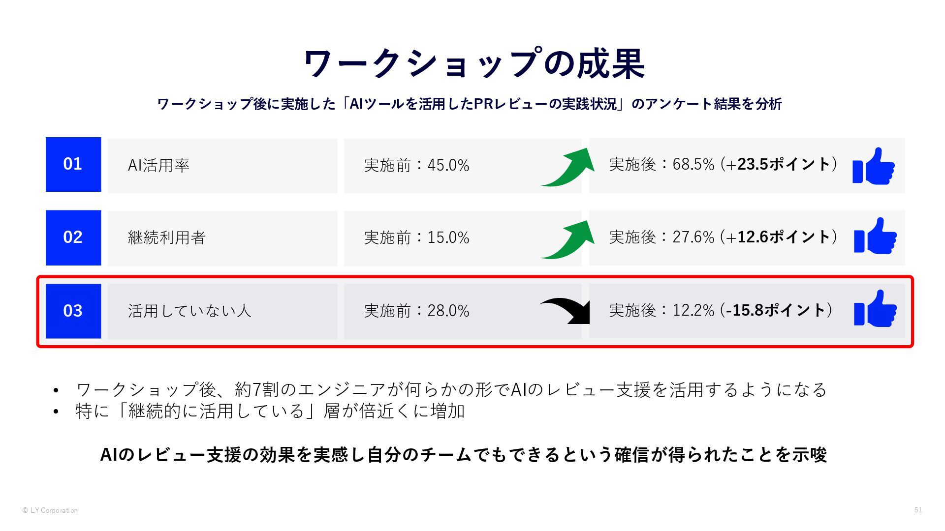 31. © LY Corporation AI活用率 50 ワークショップ後に実施した「AIツールを活用したPRレビューの実践状況」のアンケート結果を分析 ワークショップの成果 実施後:68.5% (+23.5ポイント) 実施前:45.0%
