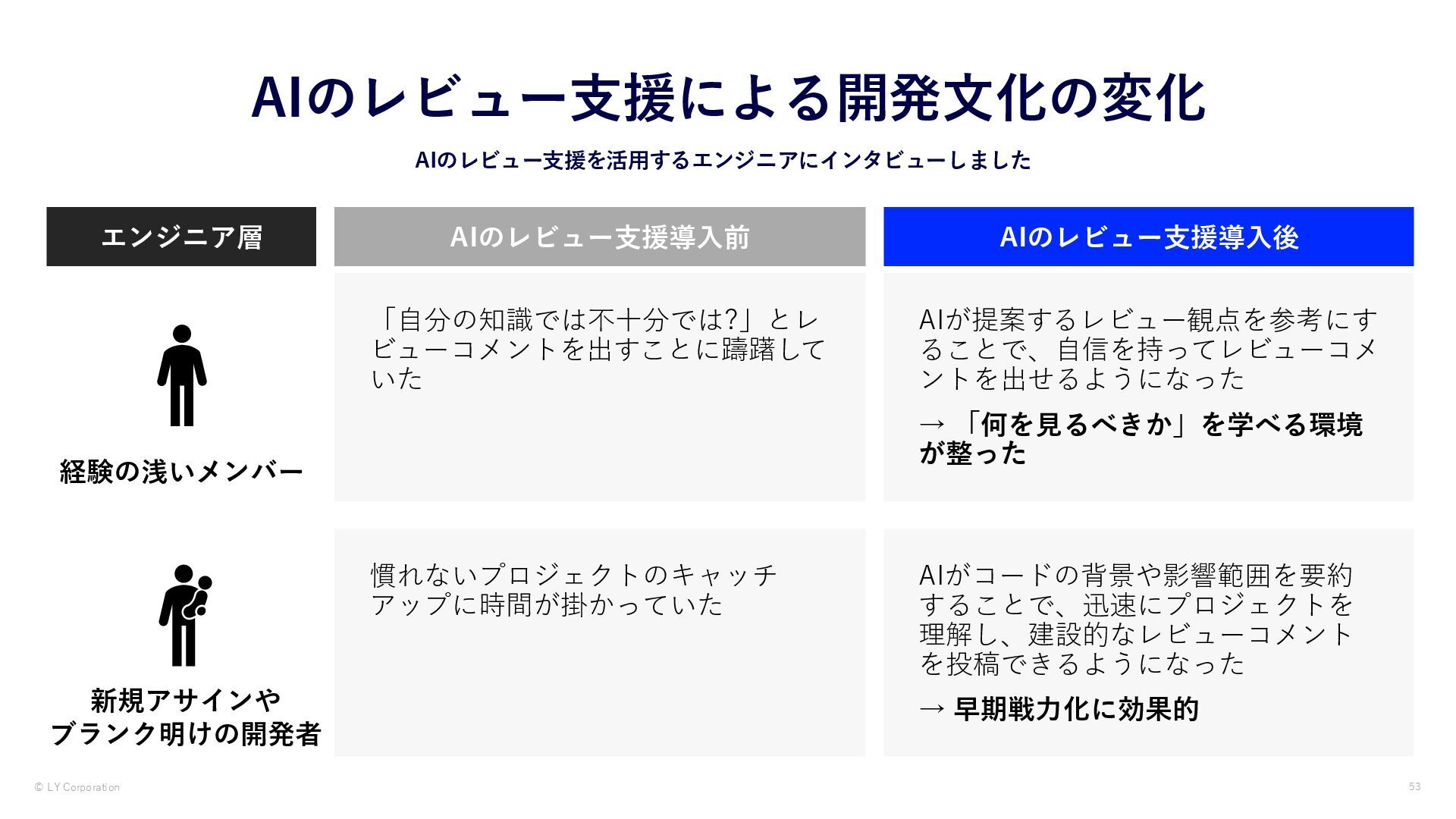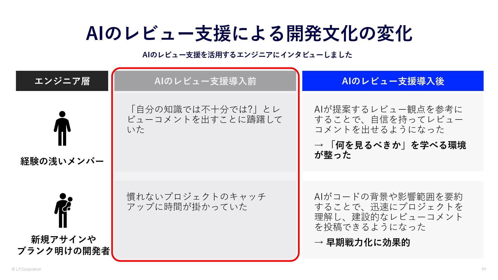 34. © LY Corporation 「自分の知識では不十分では?」とレ ビューコメントを出すことに躊躇して いた AIのレビュー支援導入後 53 AIのレビュー支援導入前 慣れないプロジェクトのキャッチ