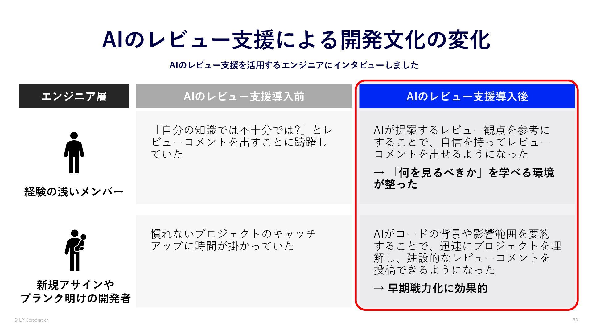 35. © LY Corporation 「自分の知識では不十分では?」とレ ビューコメントを出すことに躊躇して いた AIのレビュー支援導入後 54 AIのレビュー支援導入前 慣れないプロジェクトのキャッチ