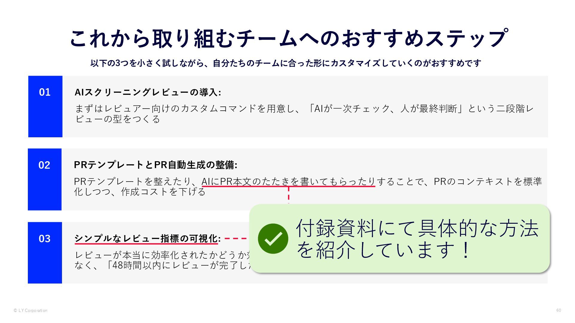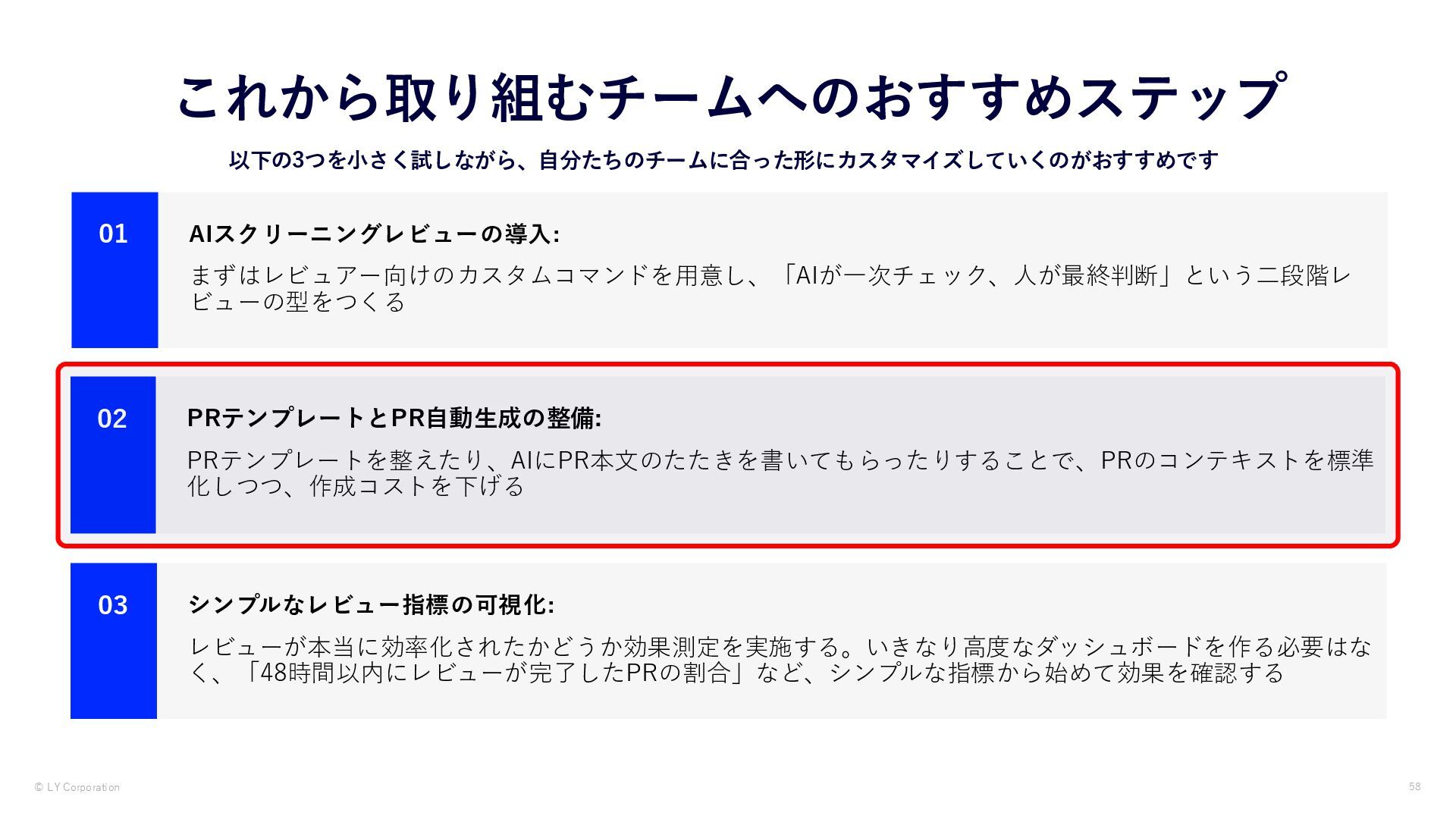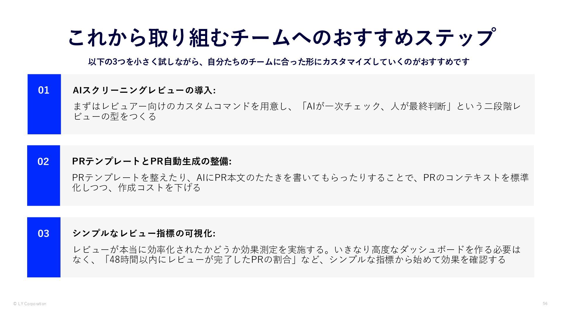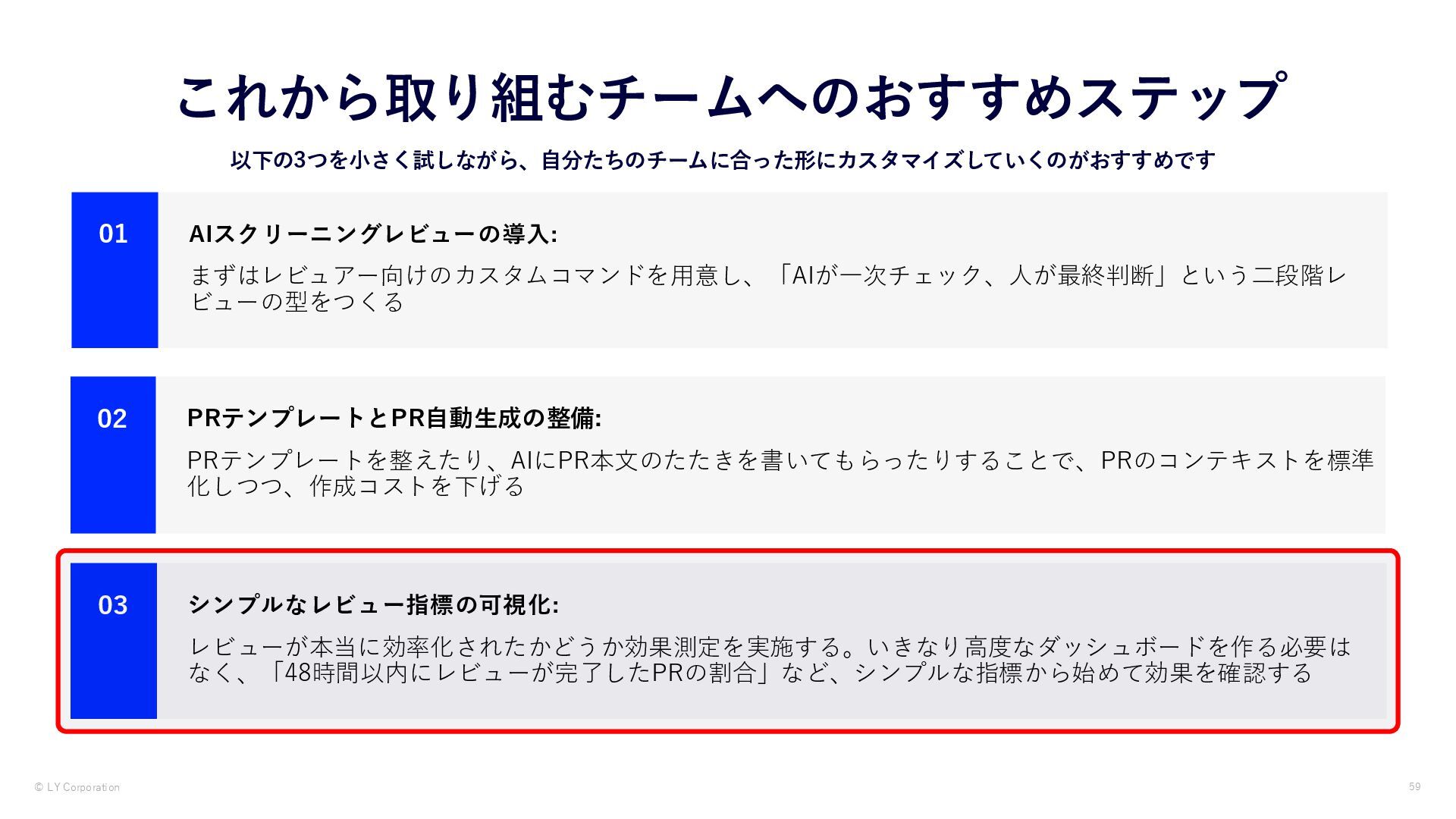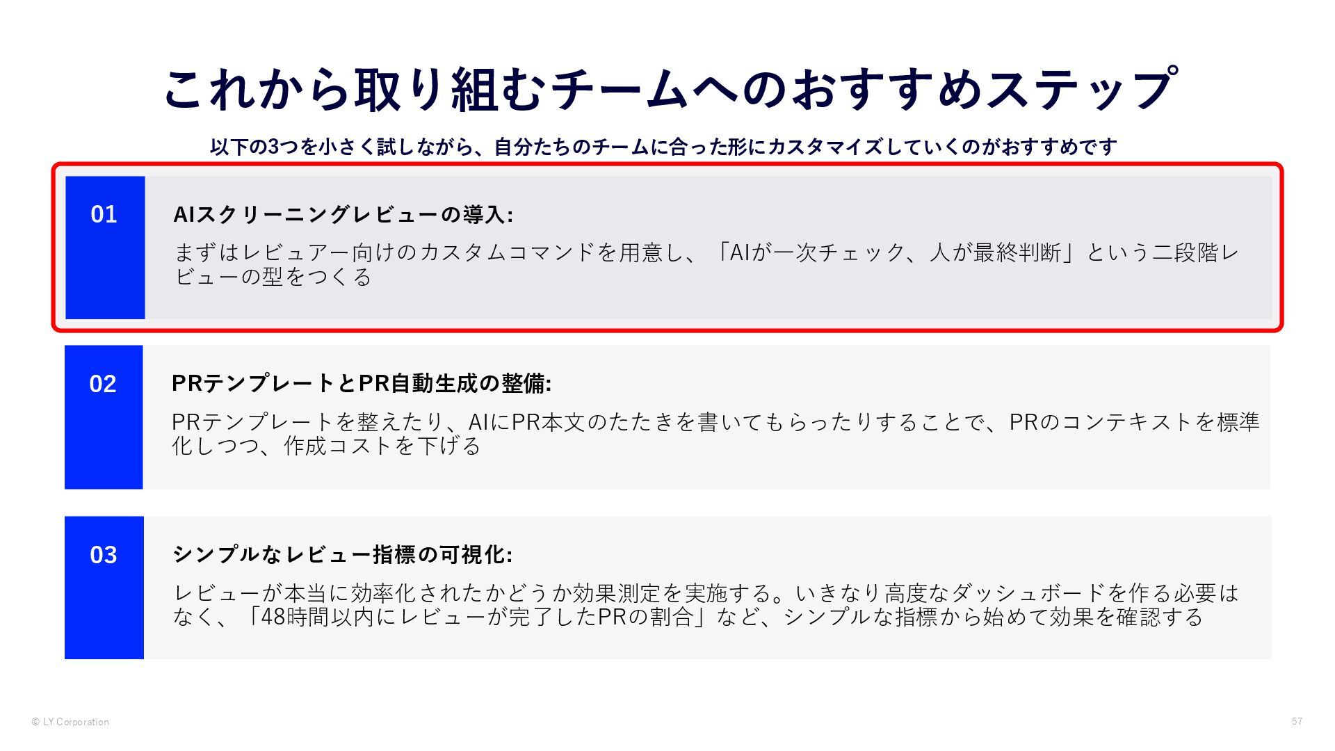 40. © LY Corporation AIスクリーニングレビューの導入: まずはレビュアー向けのカスタムコマンドを用意し、「AIが一次チェック、人が最終判断」という二段階レ ビューの型をつくる PRテンプレートとPR自動生成の整備: PRテンプレートを整えたり、AIにPR本文のたたきを書いてもらったりすることで、PRのコンテキストを標準 化しつつ、作成コストを下げる シンプルなレビュー指標の可視化: