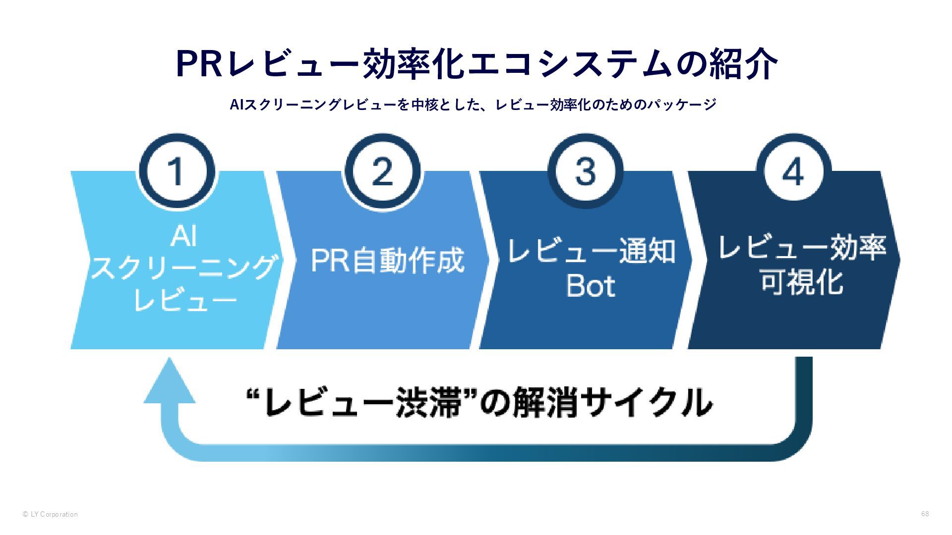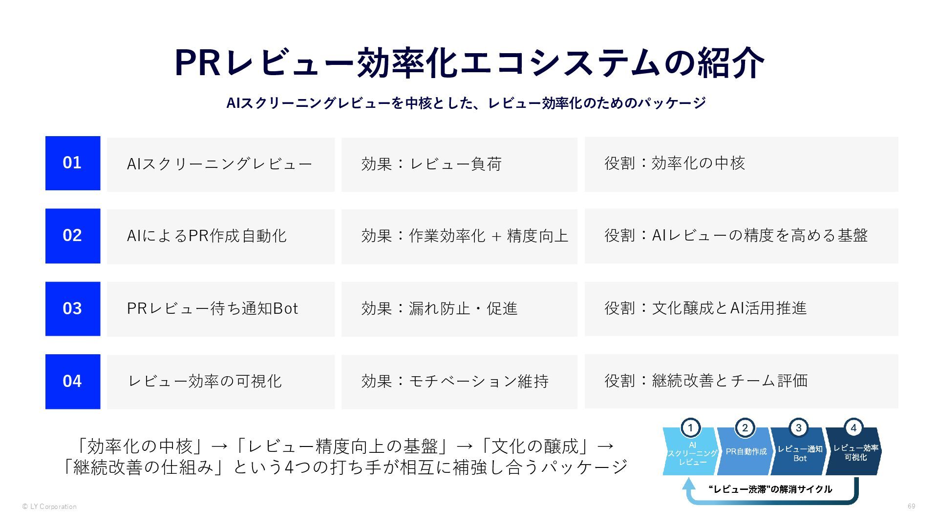 43. © LY Corporation AIスクリーニングレビュー 69 PRレビュー効率化エコシステムの紹介 役割:効率化の中核 効果:レビュー負荷 02 01