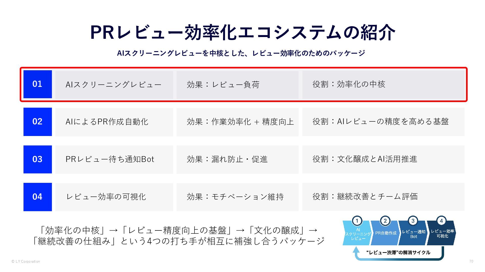 44. © LY Corporation AIスクリーニングレビュー 70 PRレビュー効率化エコシステムの紹介 役割:効率化の中核 効果:レビュー負荷 02 01