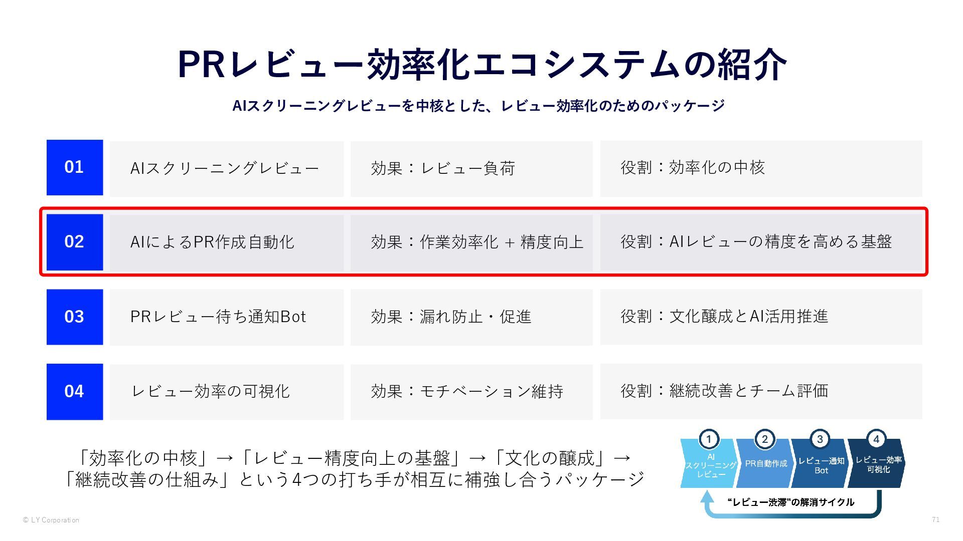 45. © LY Corporation AIスクリーニングレビュー 71 PRレビュー効率化エコシステムの紹介 役割:効率化の中核 効果:レビュー負荷 02 01