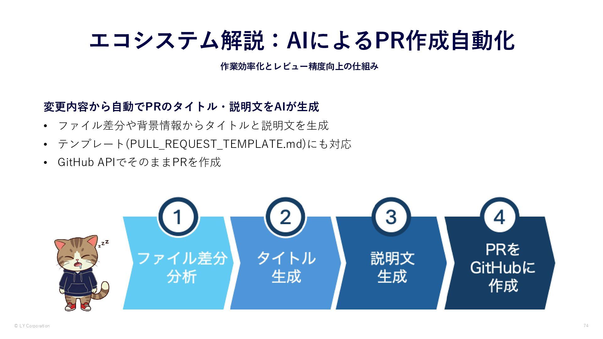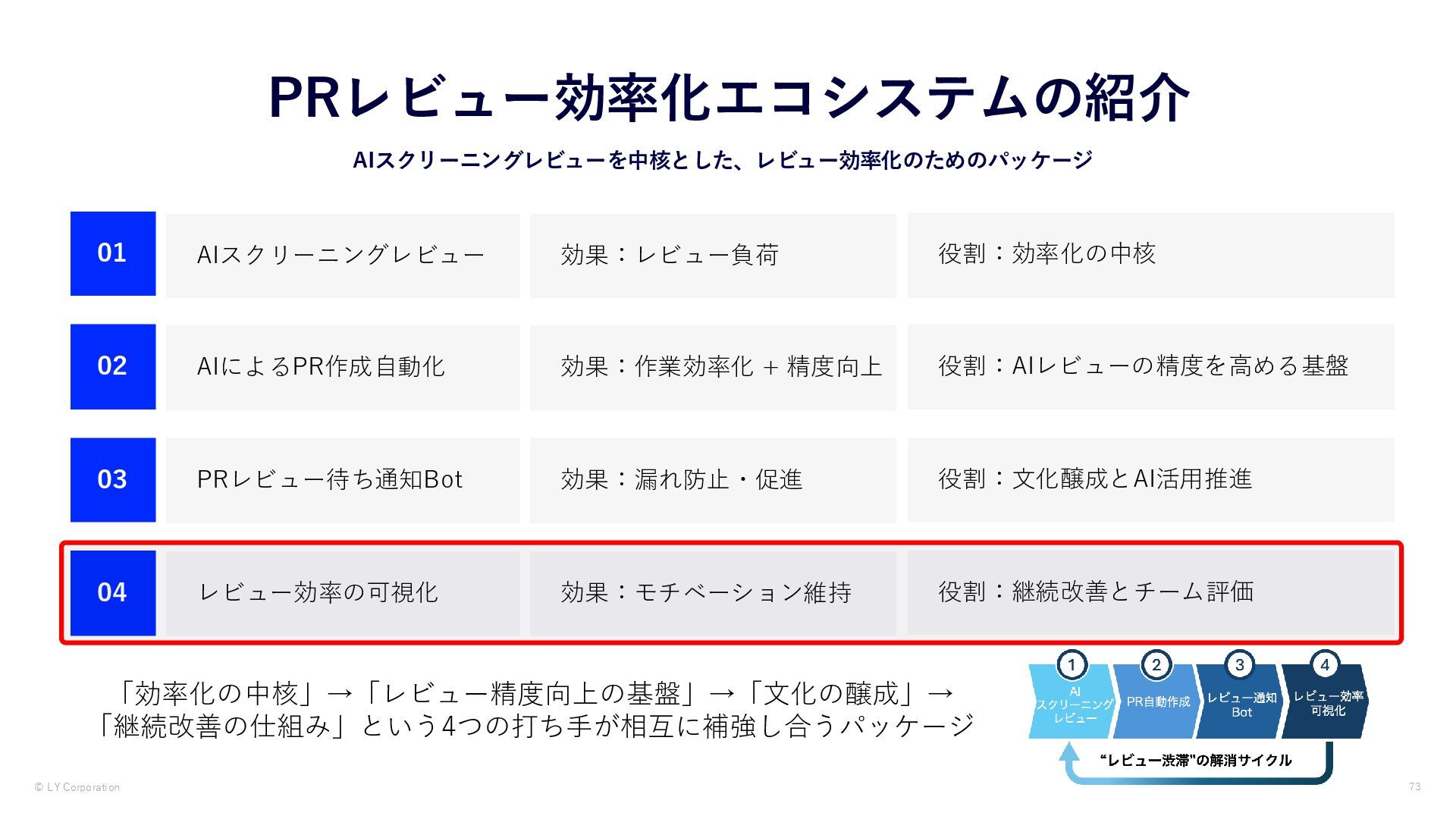 47. © LY Corporation AIスクリーニングレビュー 73 PRレビュー効率化エコシステムの紹介 役割:効率化の中核 効果:レビュー負荷 02 01