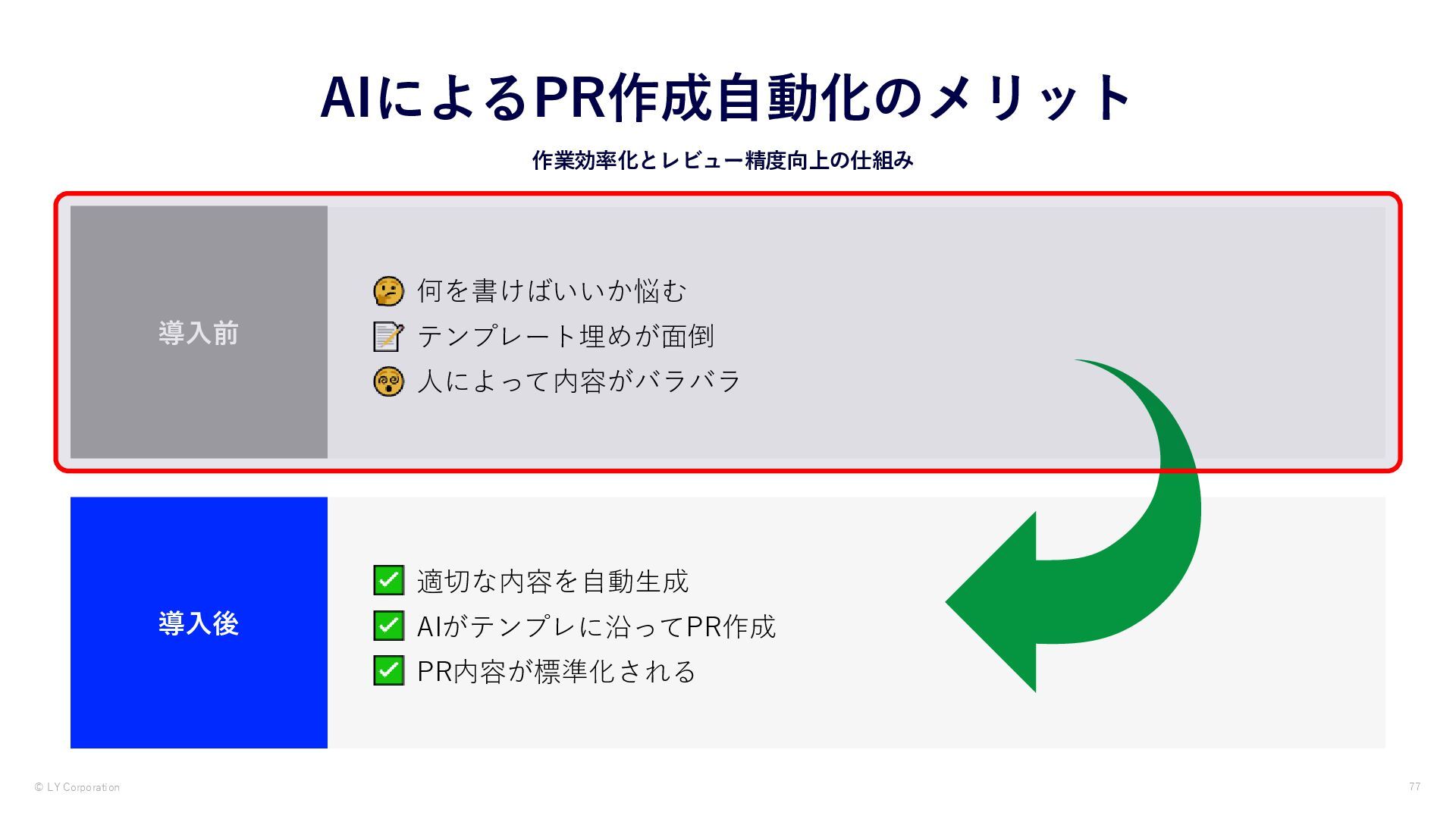 48. © LY Corporation 何を書けばいいか悩む テンプレート埋めが面倒 人によって内容がバラバラ 導入後 76 AIによるPR作成自動化のメリット 導入前