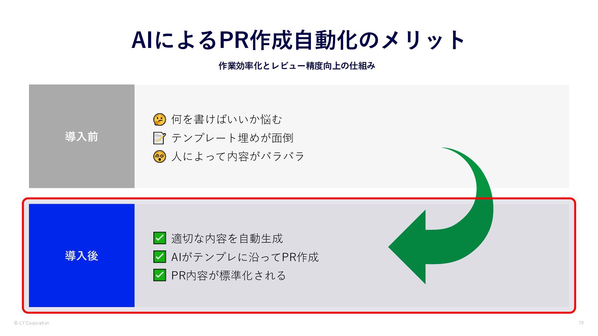 49. © LY Corporation 何を書けばいいか悩む テンプレート埋めが面倒 人によって内容がバラバラ 導入後 77 AIによるPR作成自動化のメリット 導入前
