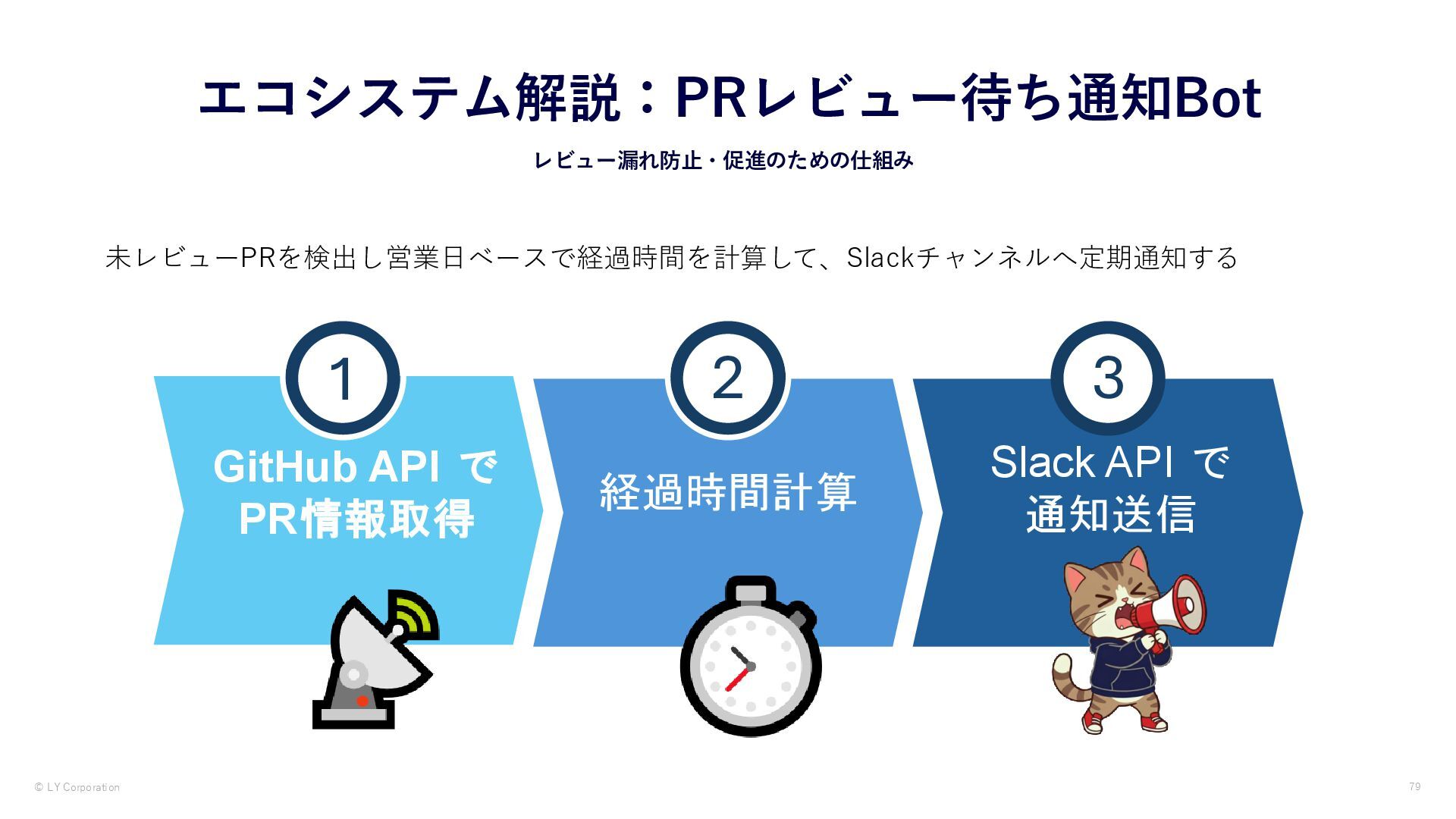 53. © LY Corporation レビュー依頼を見逃す レビューの催促が気まずい どのPRが遅れているか不明 導入後 84 PRレビュー待ち通知Botのメリット 導入前