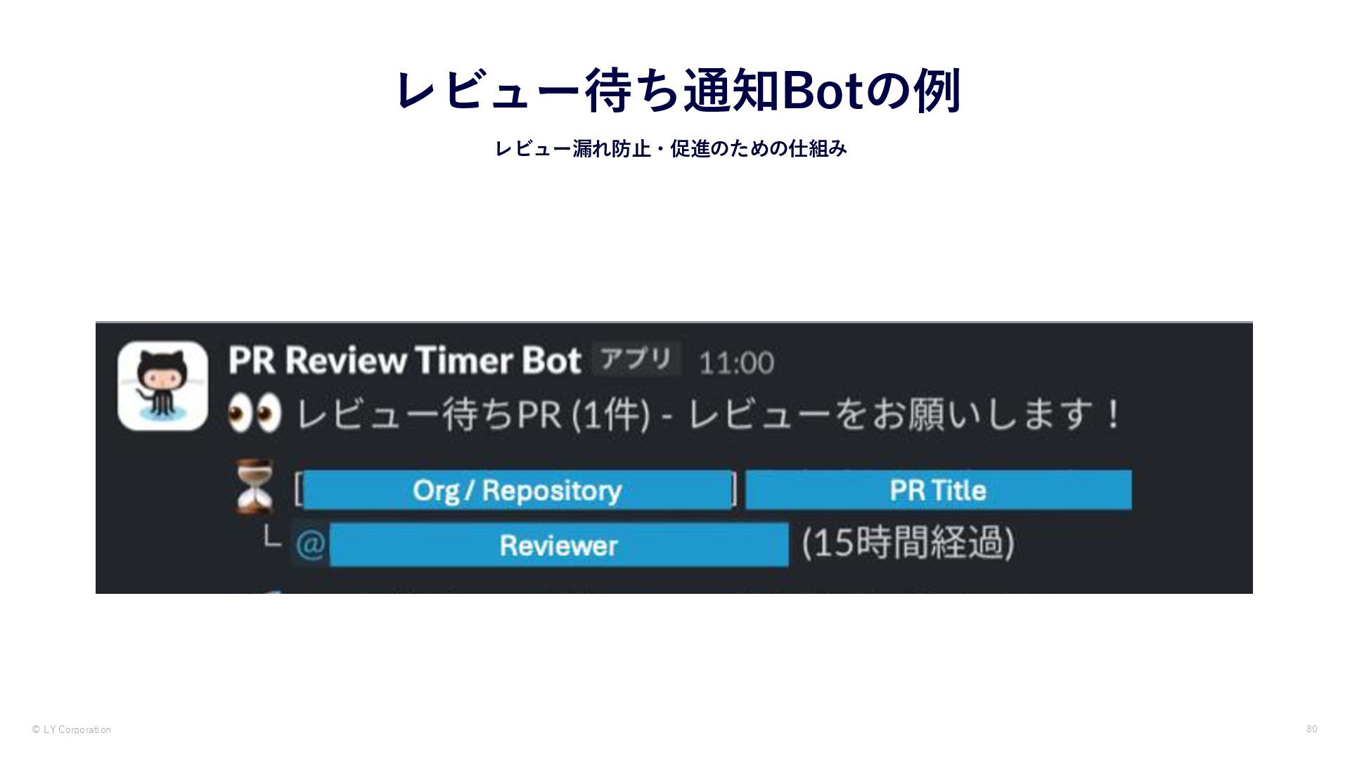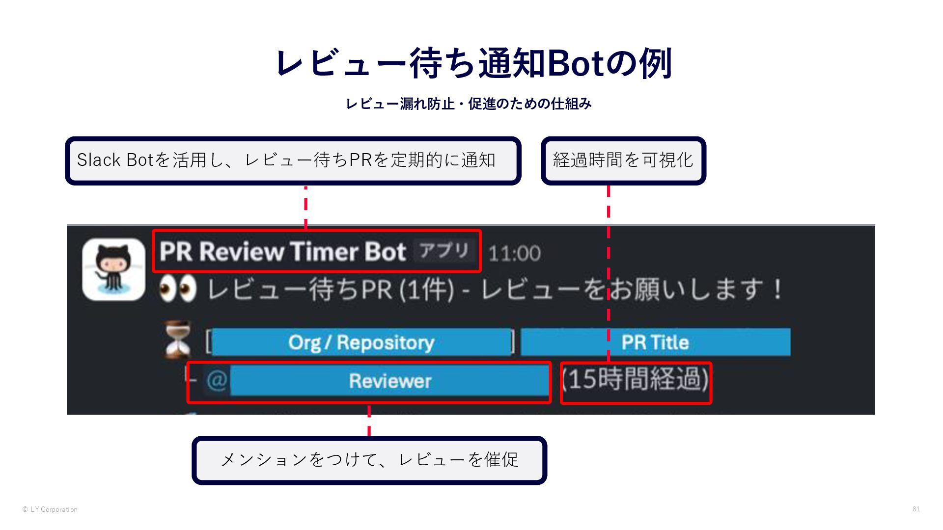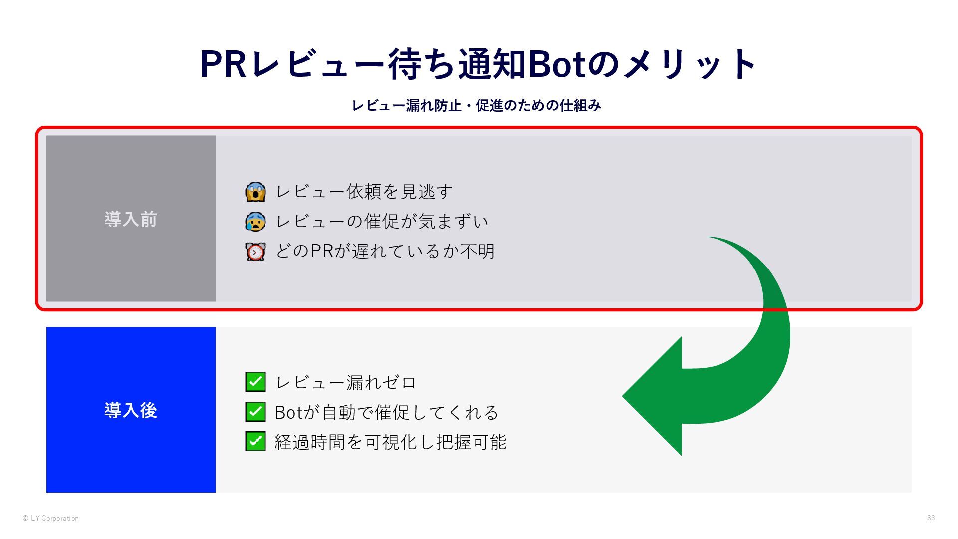 51. © LY Corporation レビュー依頼を見逃す レビューの催促が気まずい どのPRが遅れているか不明 導入後 82 PRレビュー待ち通知Botのメリット 導入前