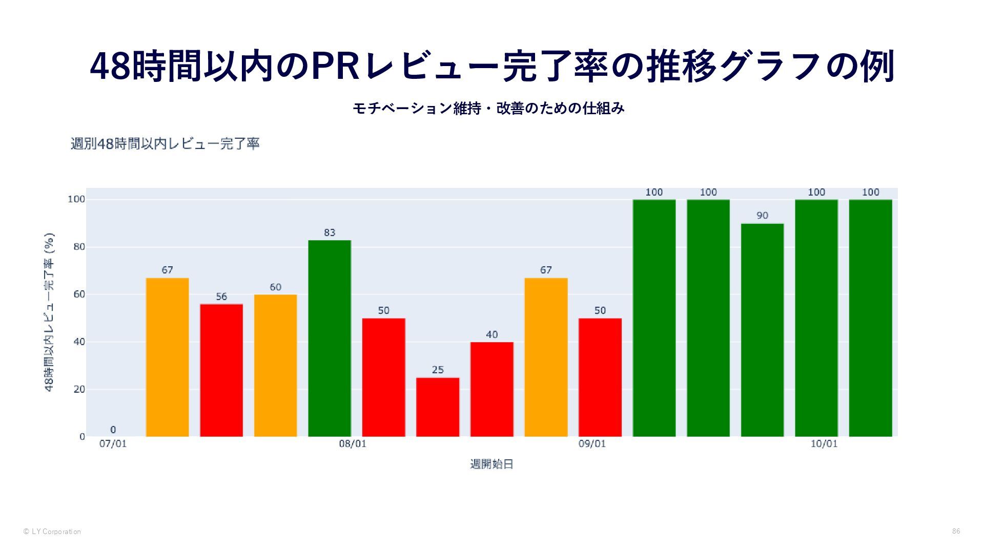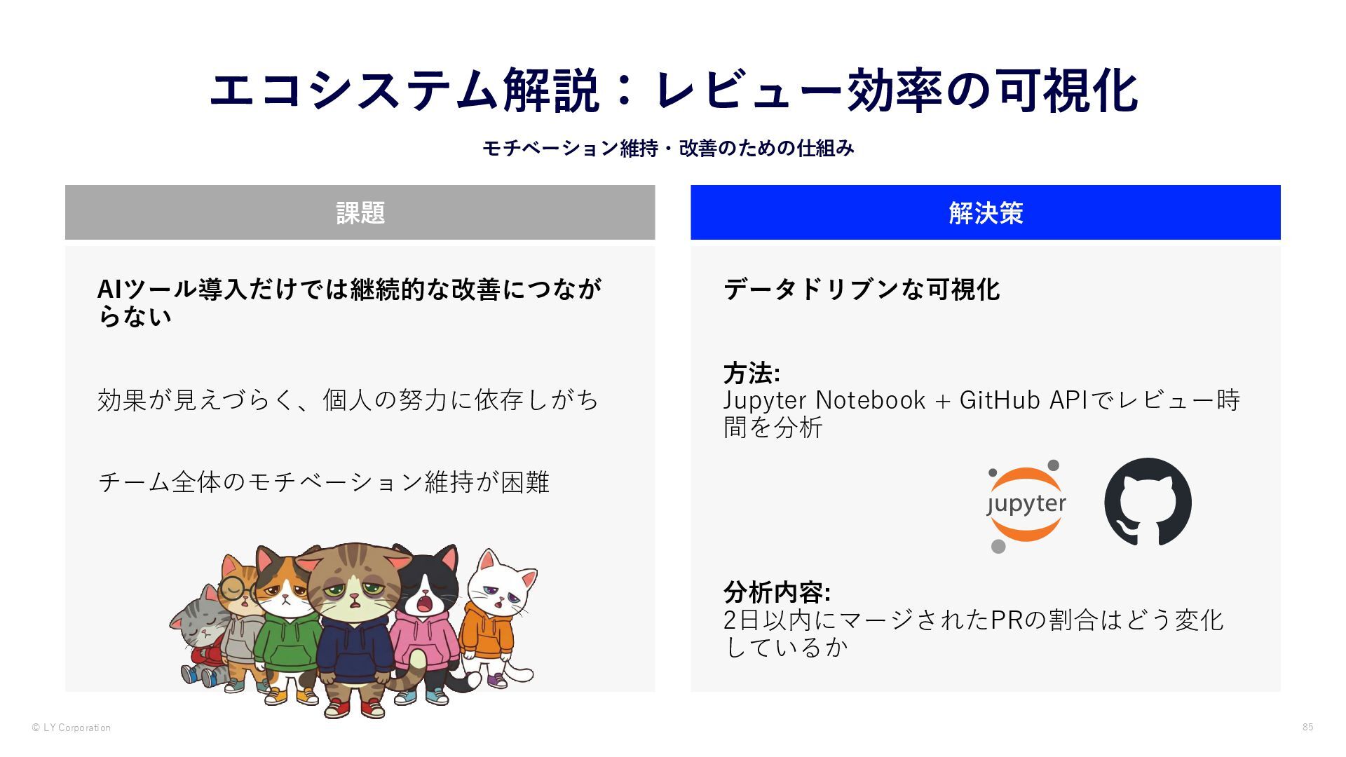 間を分析 分析内容: 2日以内にマージされたPRの割合はどう変化 しているか AIツール導入だけでは継続的な改善につなが らない 効果が見えづらく、個人の努力に依存しがち チーム全体のモチベーション維持が困難 解決策 85 モチベーション維持・改善のための仕組み エコシステム解説:レビュー効率の可視化 課題