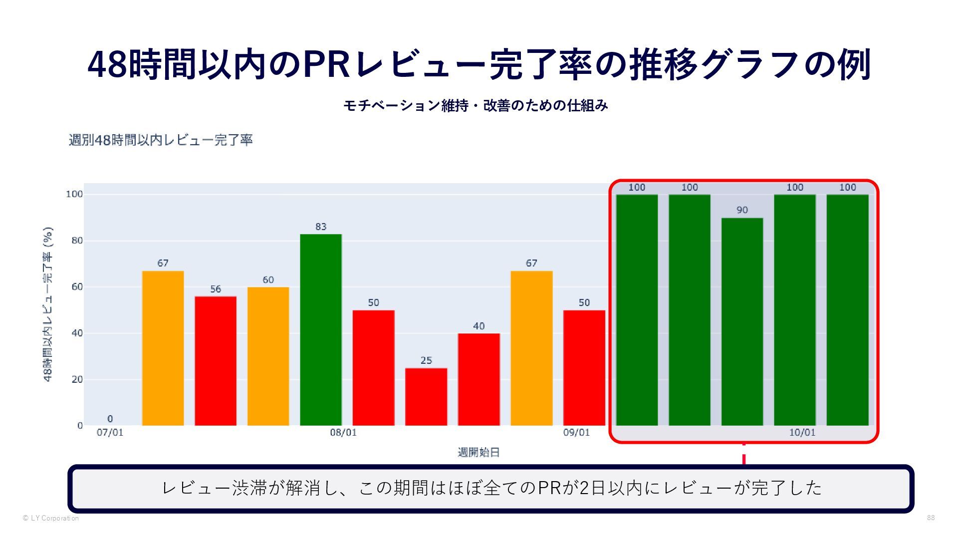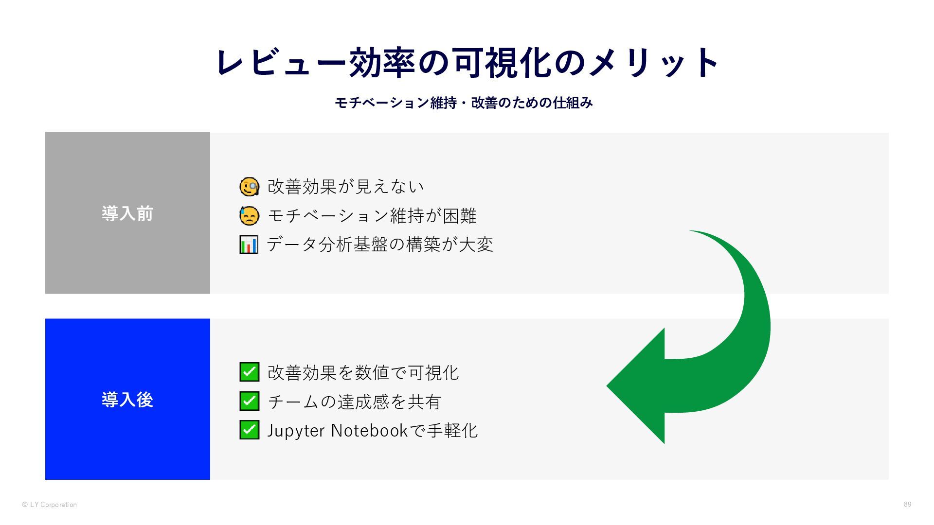55. © LY Corporation 改善効果が見えない モチベーション維持が困難 データ分析基盤の構築が大変 導入後 89 レビュー効率の可視化のメリット 導入前