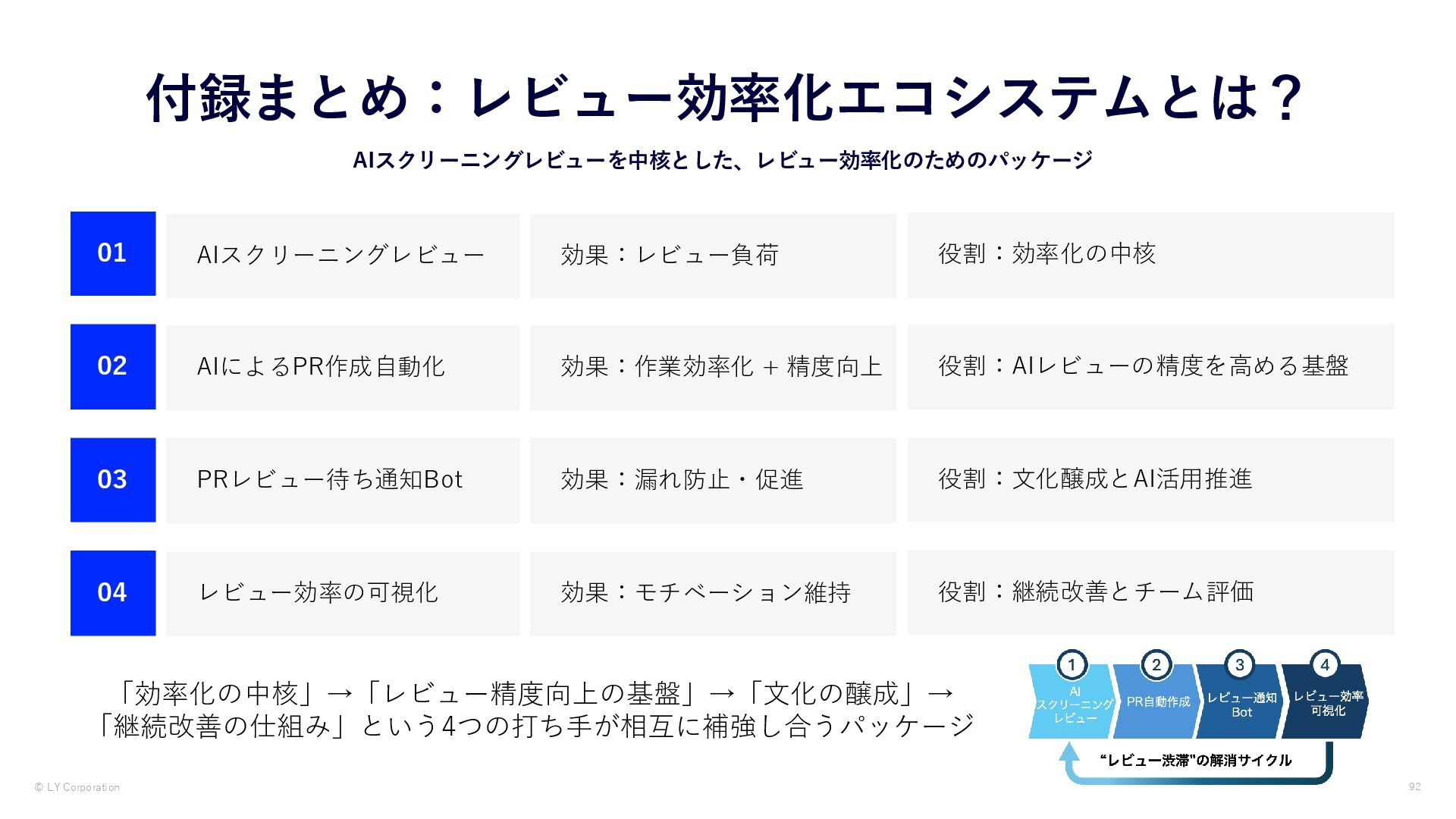 58. © LY Corporation AIスクリーニングレビュー 92 AIスクリーニングレビューを中核とした、レビュー効率化のためのパッケージ 付録まとめ:レビュー効率化エコシステムとは? 役割:効率化の中核 効果:レビュー負荷 02