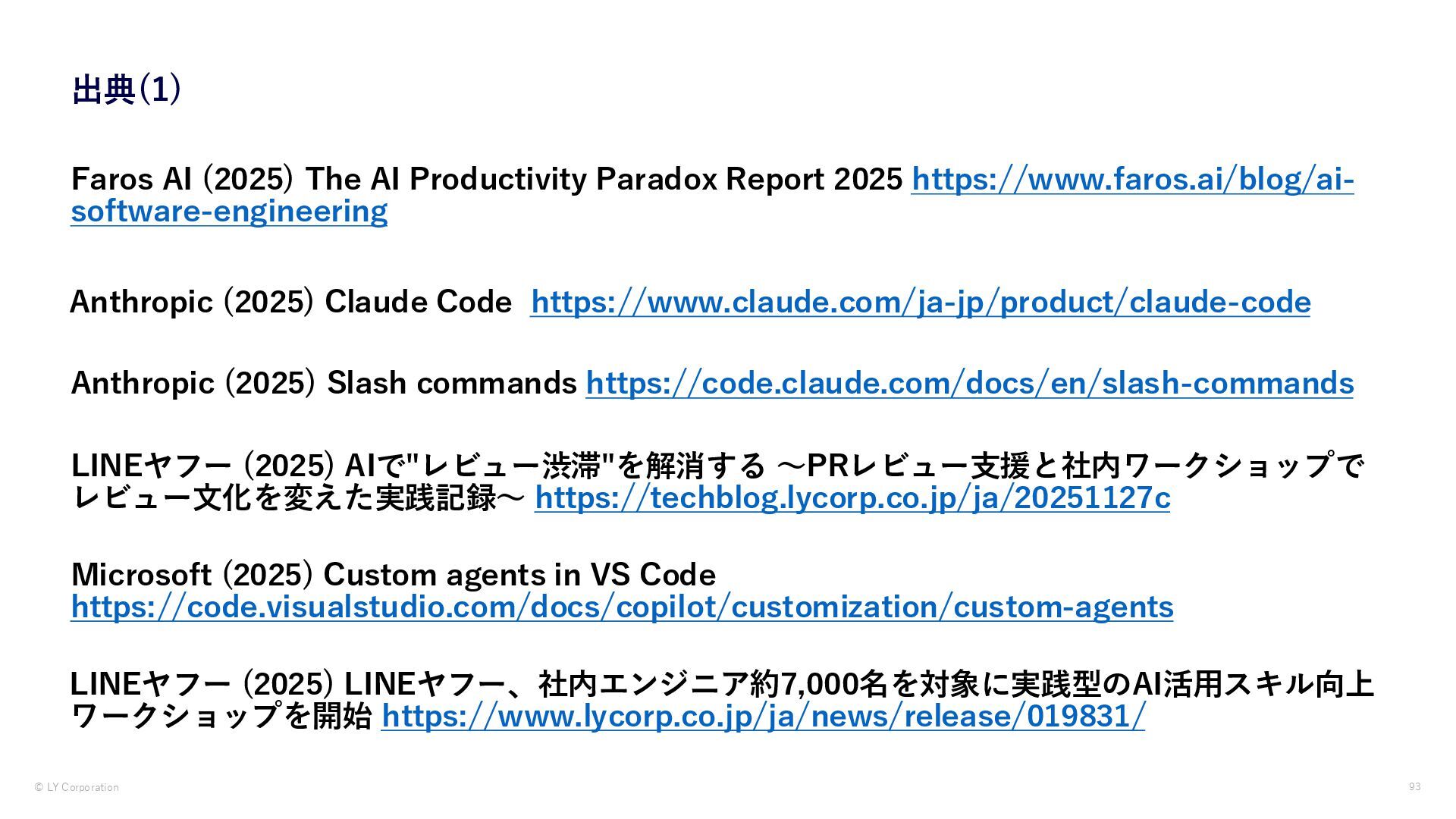 Paradox Report 2025 https://www.faros.ai/blog/ai- software-engineering Anthropic (2025) Claude Code https://www.claude.com/ja-jp/product/claude-code Anthropic (2025) Slash commands https://code.claude.com/docs/en/slash-commands LINEヤフー (2025) AIで"レビュー渋滞"を解消する 〜PRレビュー支援と社内ワークショップで レビュー文化を変えた実践記録〜 https://techblog.lycorp.co.jp/ja/20251127c 93 LINEヤフー (2025) LINEヤフー、社内エンジニア約7,000名を対象に実践型のAI活用スキル向上 ワークショップを開始 https://www.lycorp.co.jp/ja/news/release/019831/ Microsoft (2025) Custom agents in VS Code https://code.visualstudio.com/docs/copilot/customization/custom-agents