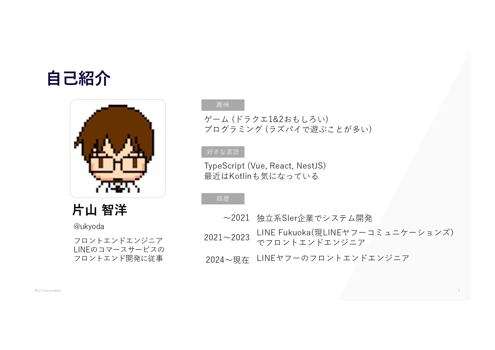 © LY Corporation 2 ⾃⼰紹介 ⽚⼭ 智洋 好きな⾔語 TypeScript (Vue,