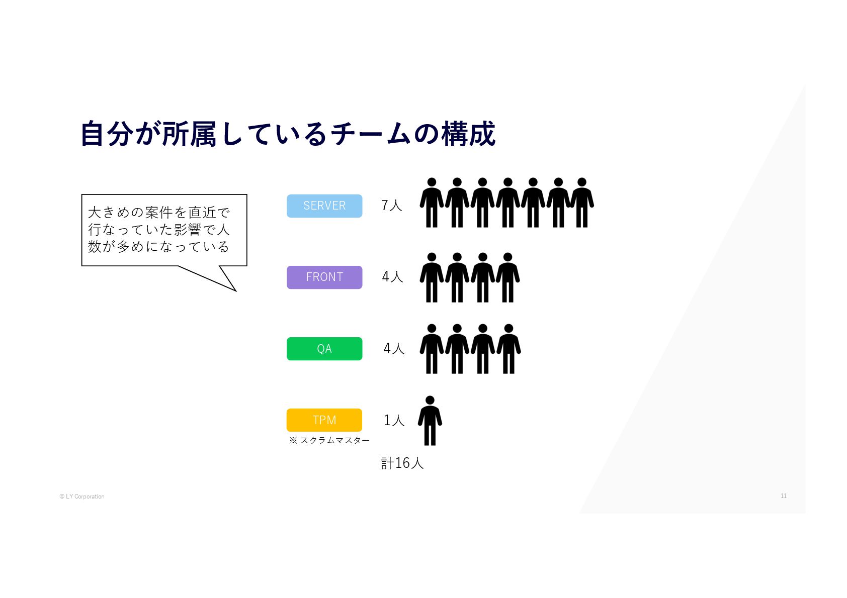 © LY Corporation 11 ⾃分が所属しているチームの構成 SERVER FRONT QA TPM 計16⼈