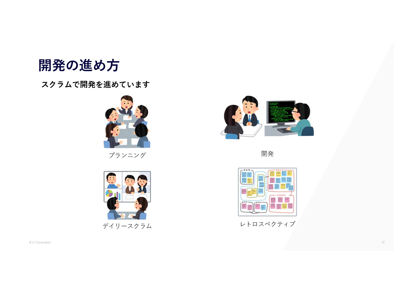 © LY Corporation 12 開発の進め⽅ スクラムで開発を進めています 開発 プランニング デイリースクラム レトロスペクティブ