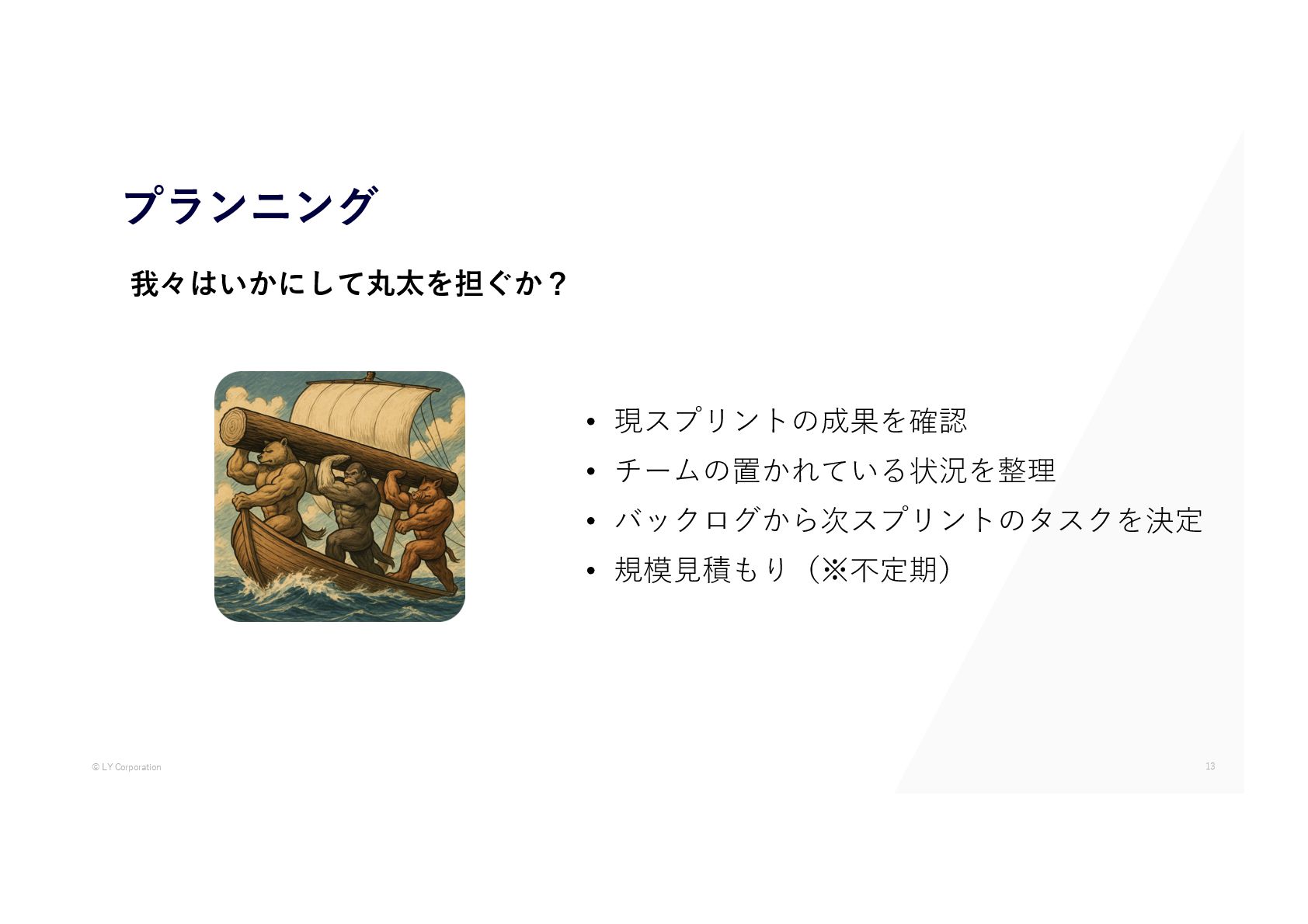 © LY Corporation 13 プランニング • 現スプリントの成果を確認 • チームの置かれている状況を整理 •
