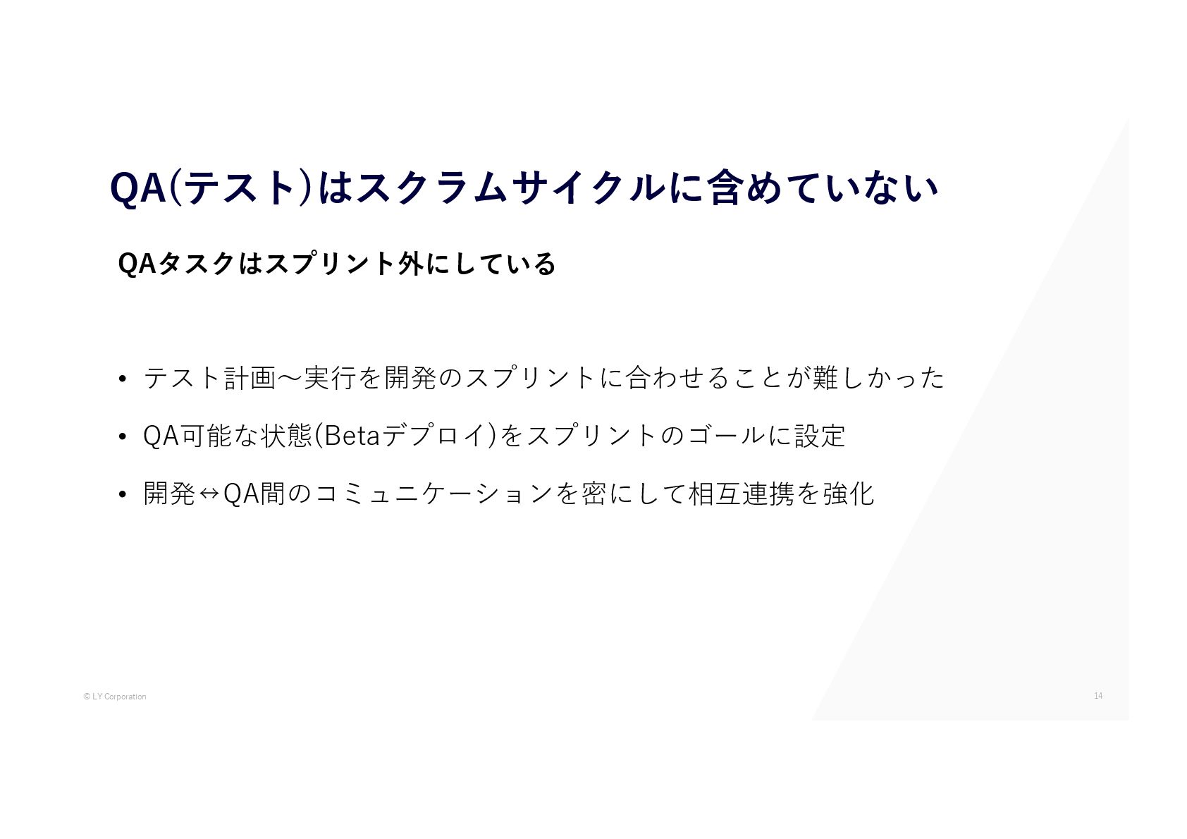 © LY Corporation 14 QA(テスト)はスクラムサイクルに含めていない QAタスクはスプリント外にしている • テスト計画〜実⾏を開発のスプリントに合わせることが難しかった • QA可能な状態(Betaデプロイ)をスプリントのゴールに設定